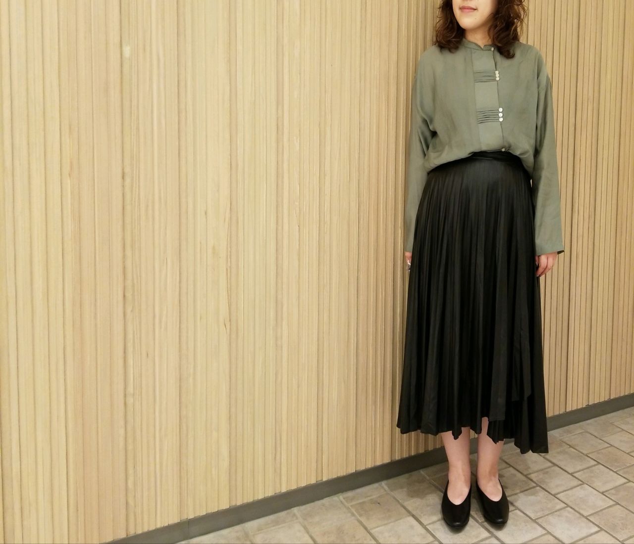 ピスタチオカラーのシャツとブラックのフェイクレザースカートにBLKを合わせてみました!