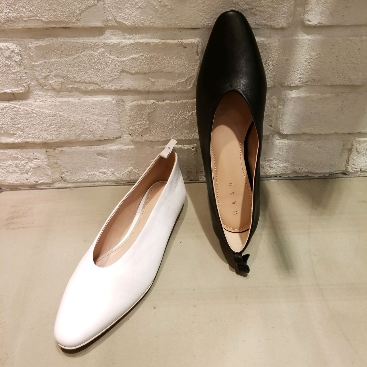 『WASH』新作のプルストラップが個性的なフラットシューズです。