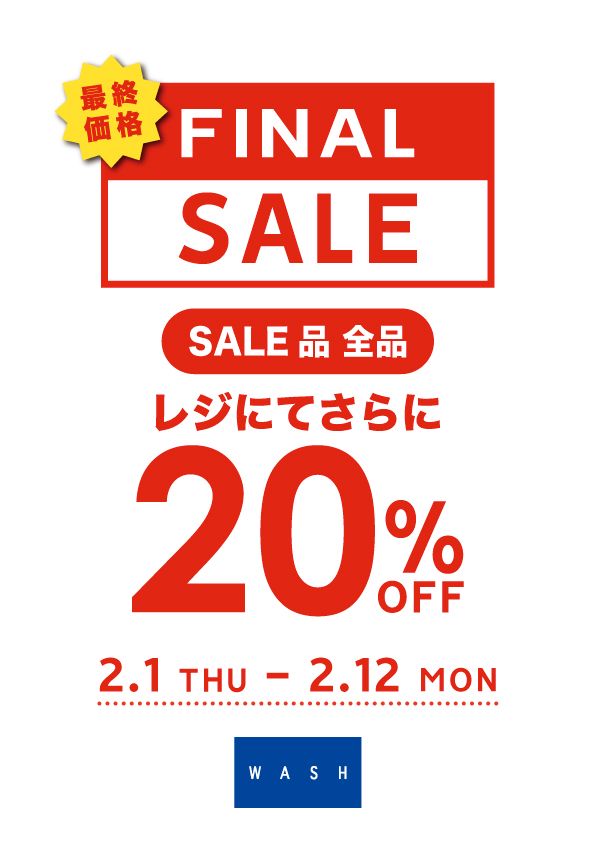 WASHでは、店内のSALE品が全品レジにてさらに20%OFF!!