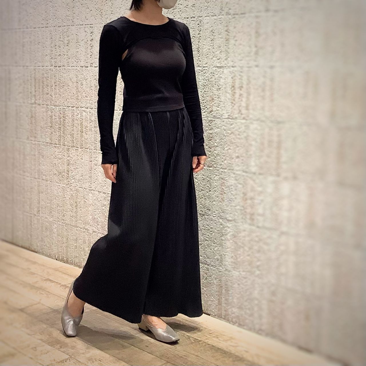 ブラックコーデに敢えてシルバーを投入し、靴が主役に。