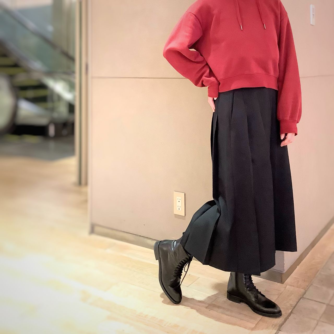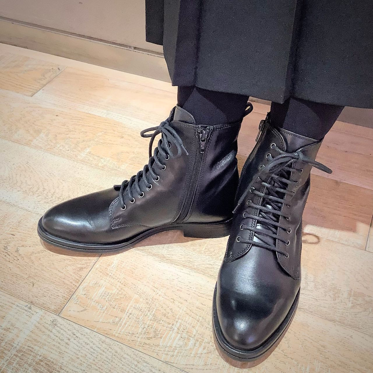 スカートのコーデにレースアップブーツはクラシカルな雰囲気。