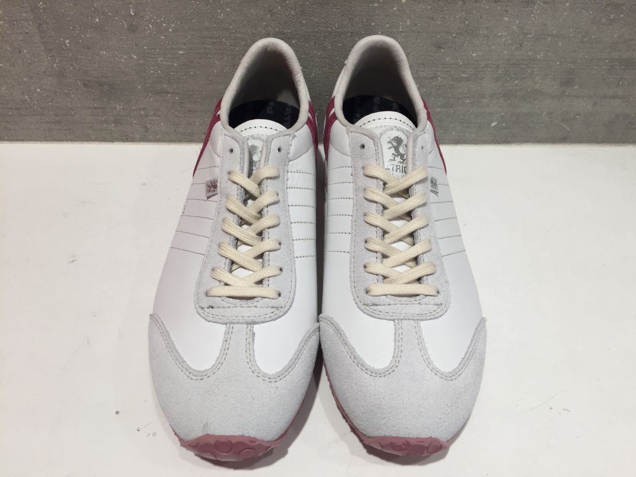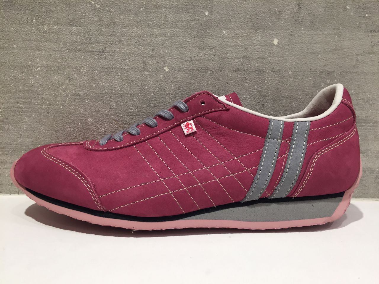 ヌバックピンクをベースにグレーのラインとシューレース、クサビ。