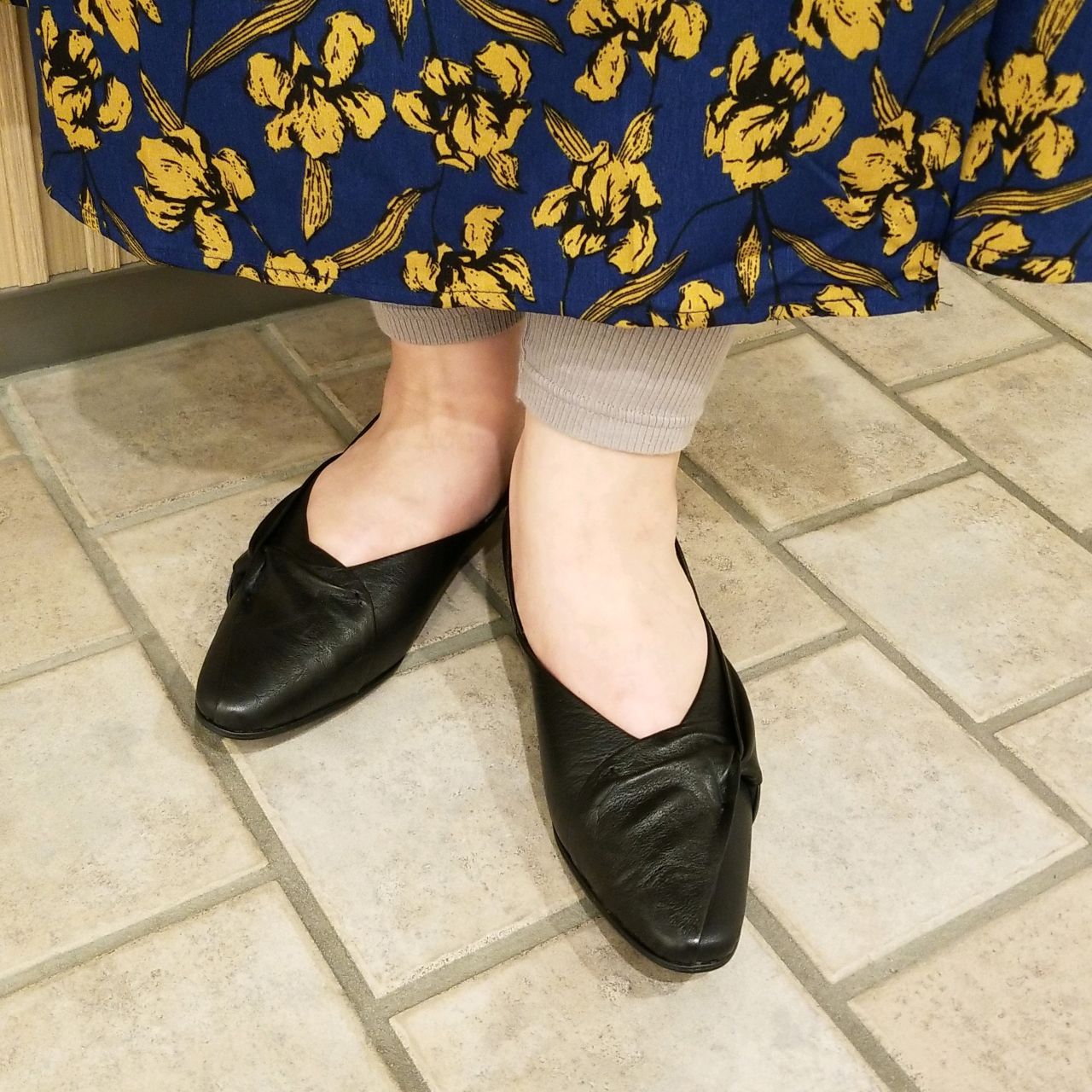 アッパーのドレープのデザインが目を引くフラットシューズです。