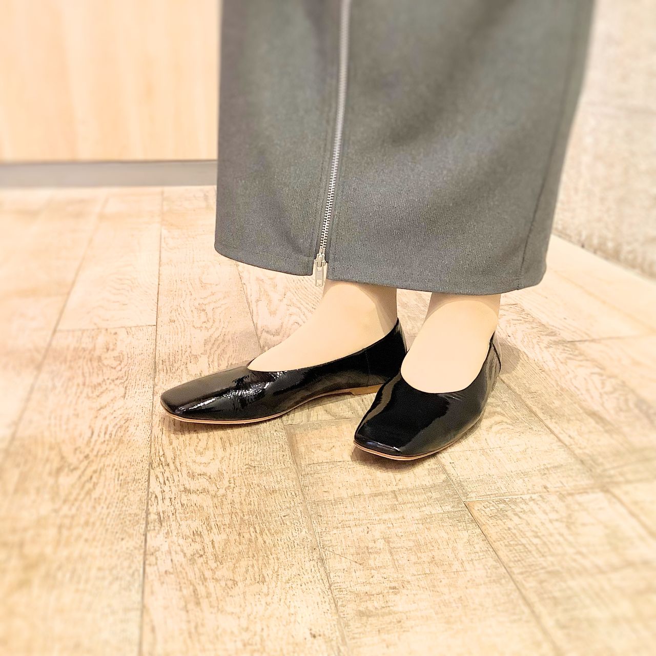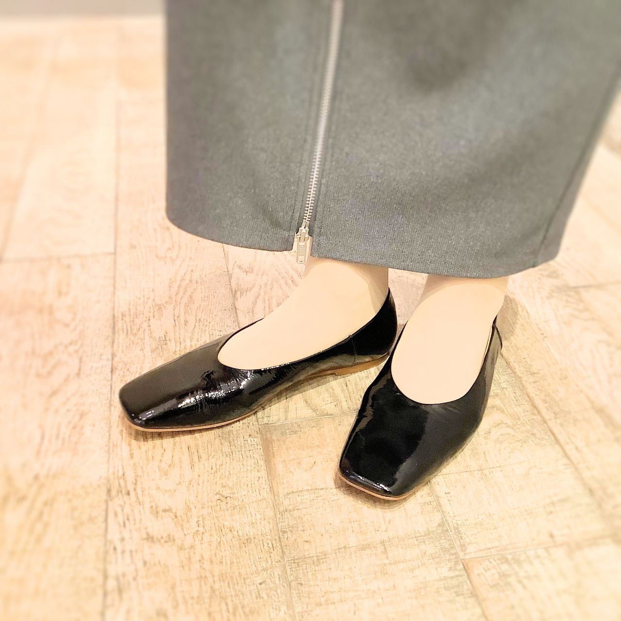 スクエアトがモードな雰囲気で足先の締め付け感が少なく、