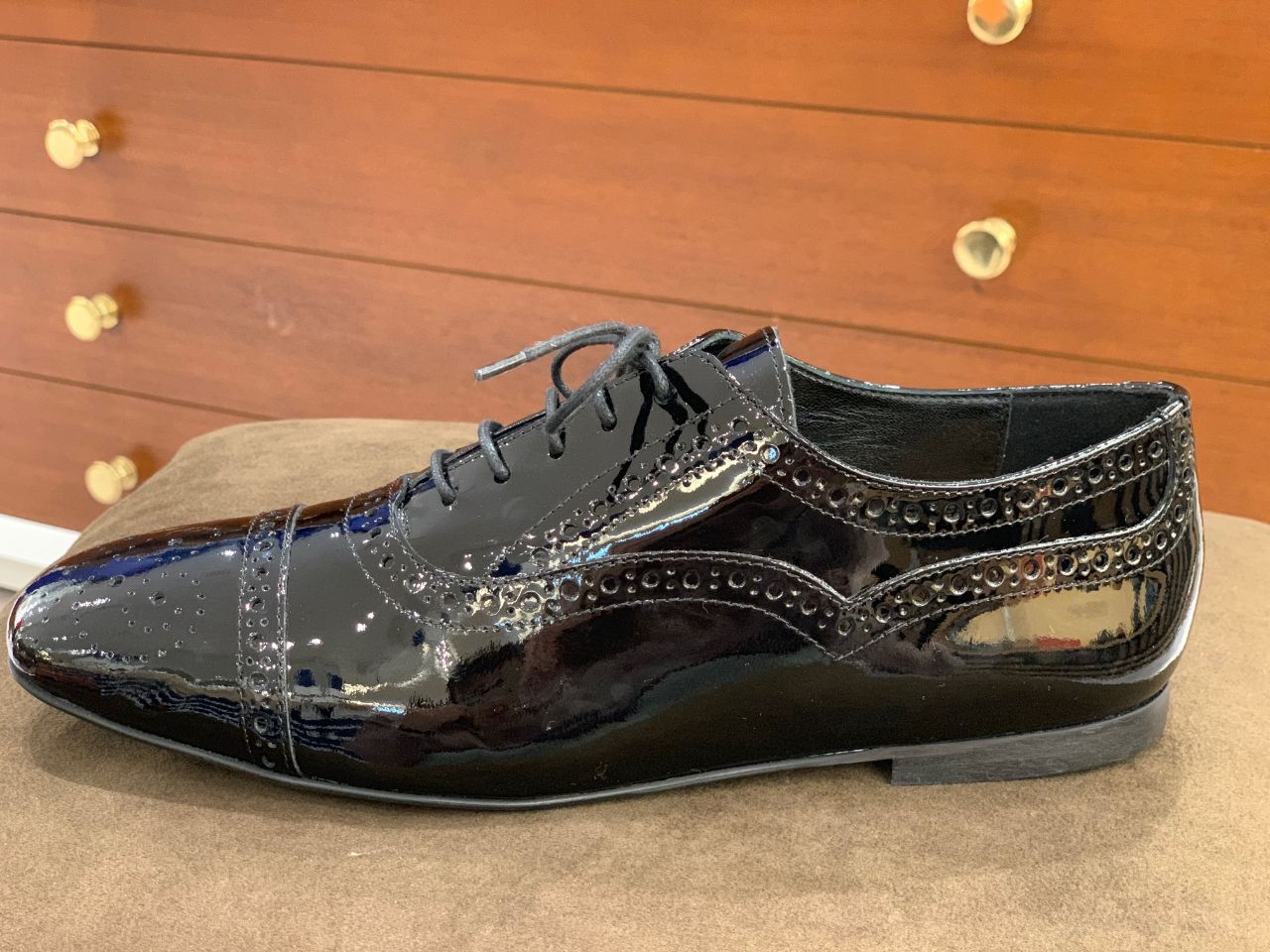 内羽根レースアップ仕様に穴飾りが特徴的なシューズ。