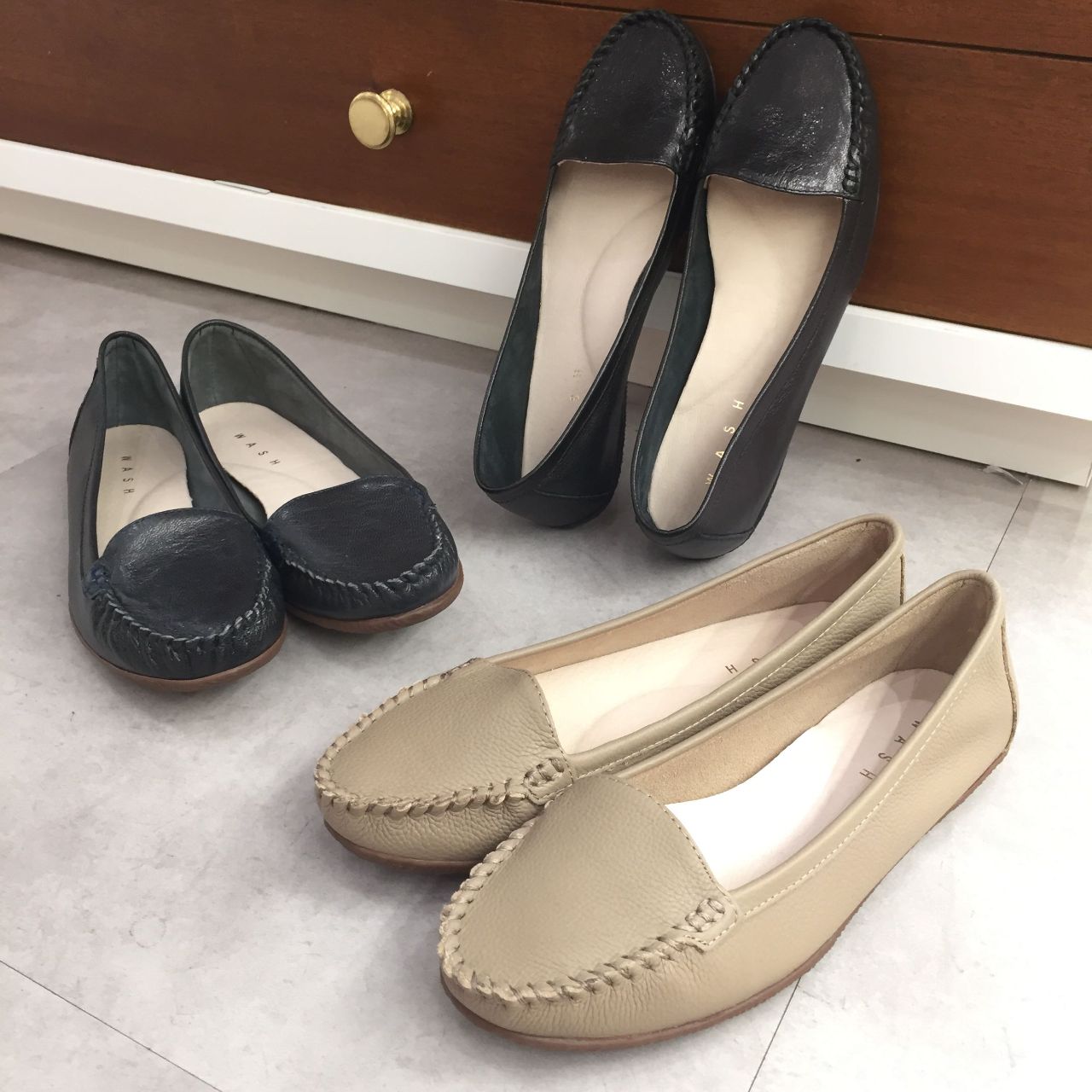 WASH柔らかレザーのフラットシューズ