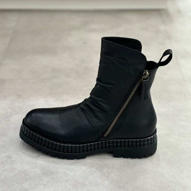 シャフト部分に斜めに入ったジッパーが特徴的なモード感のあるブーツ。