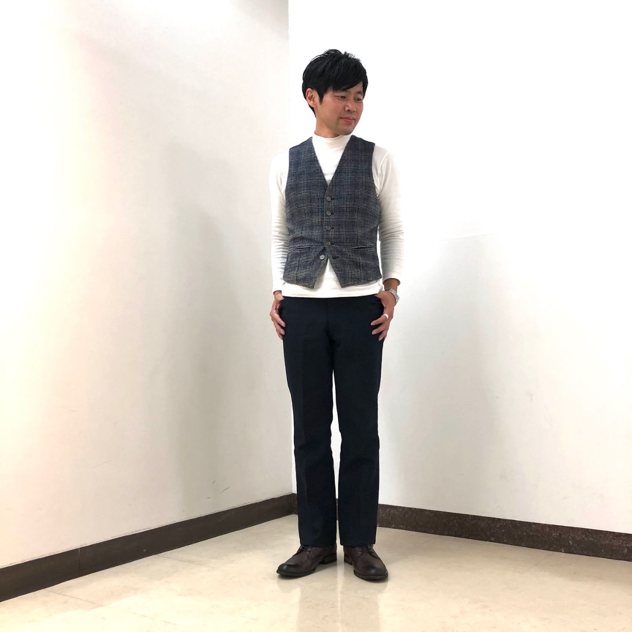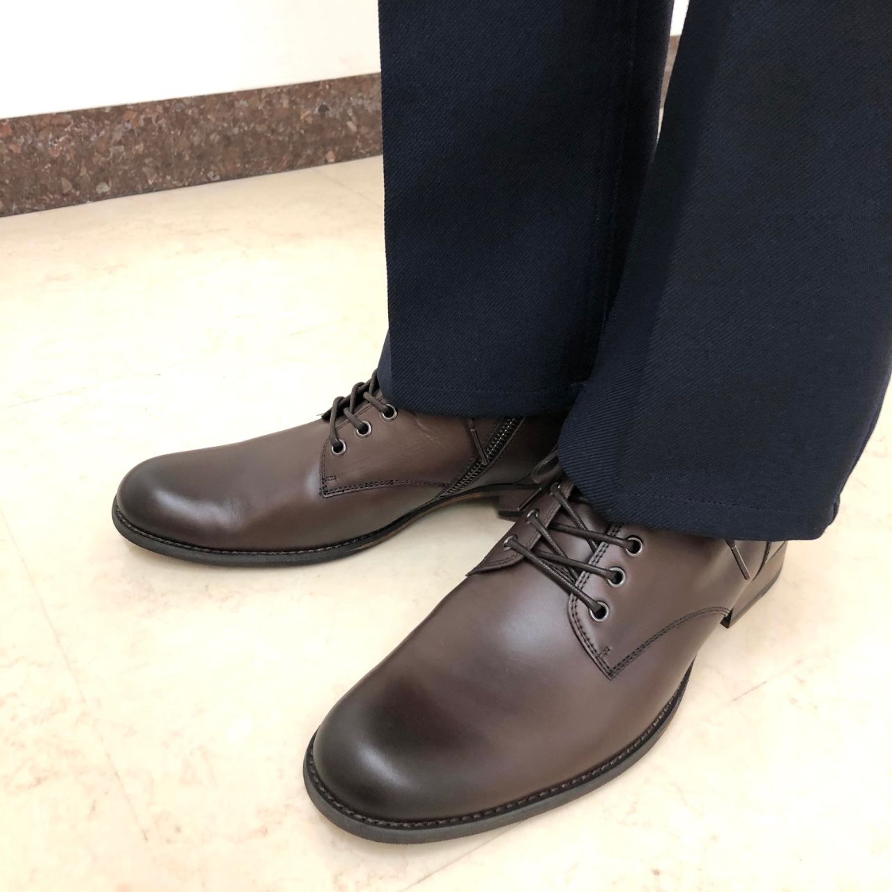 個人的なオススメはブラックも鉄板ですが、ネイビーのパンツにブラウンブーツのコーディネート。