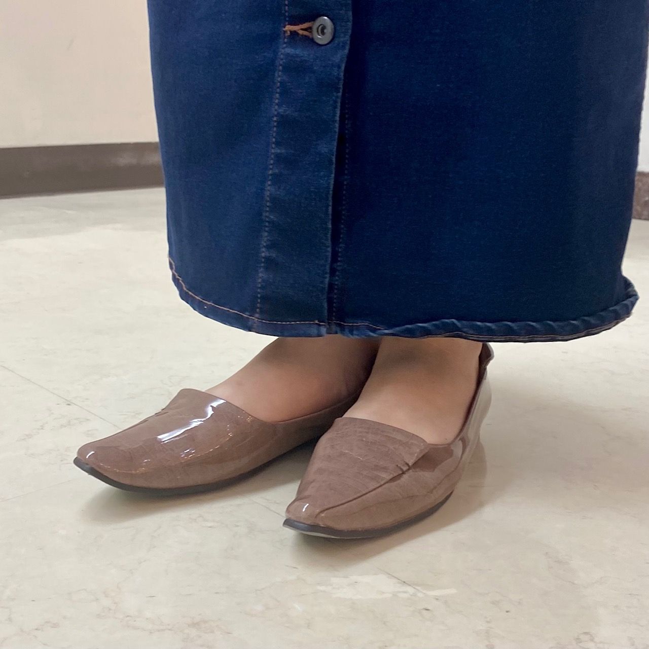 ツヤ感のあるエナメルで足元を明るくすることで
