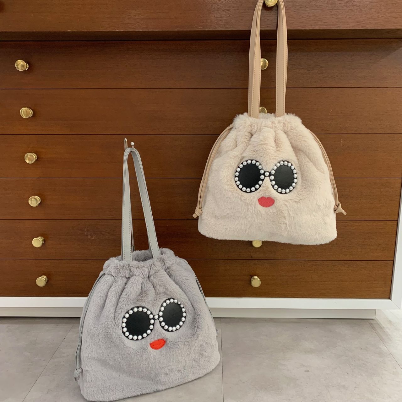 もこもこのフェイクファーにパールで縁取ったサングラスがとってもかわいい顔のハンドバッグです。