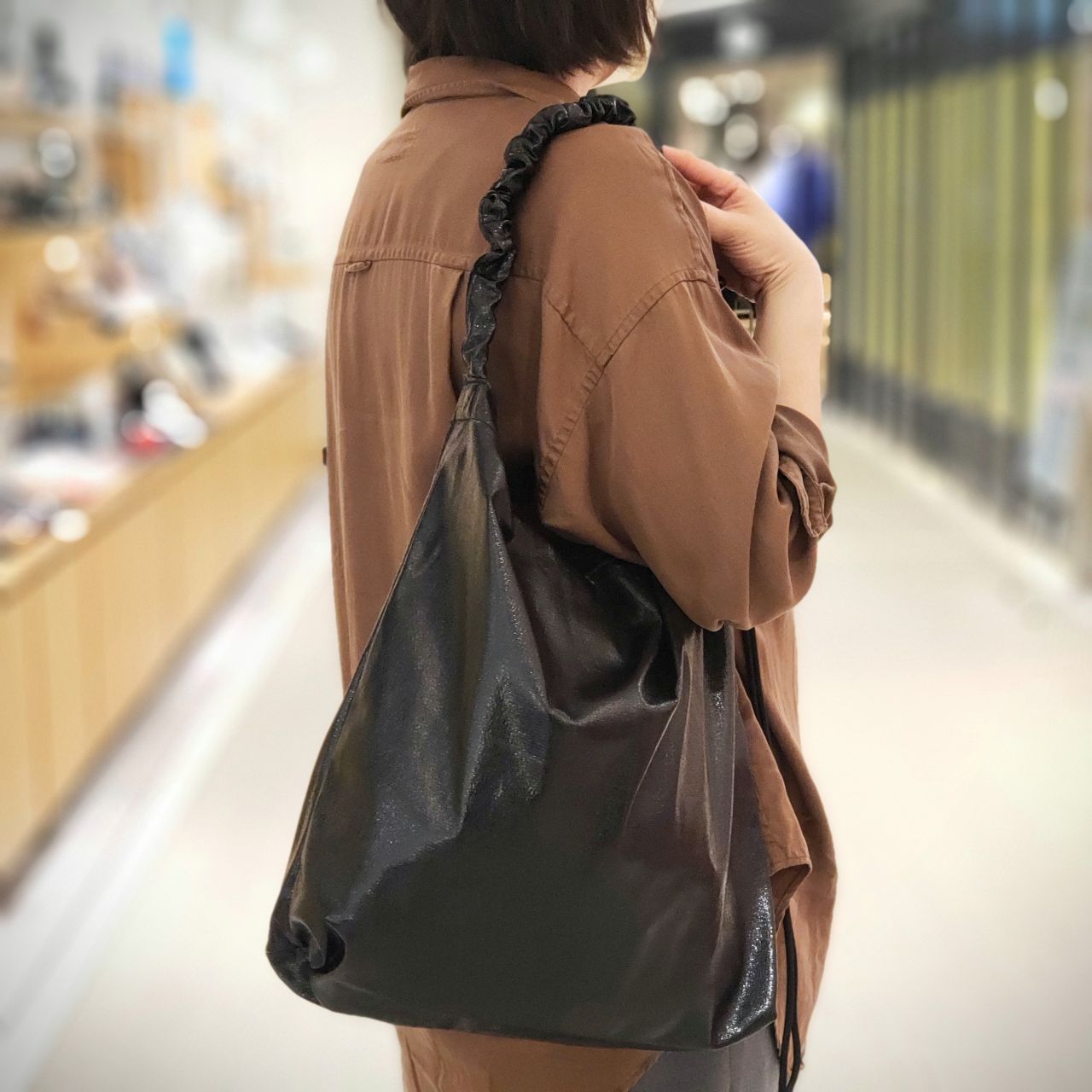 クシュっとギャザーを寄せたショルダーはサイドのひもで長さを調整できるので肩掛けから斜め掛けまでOK。