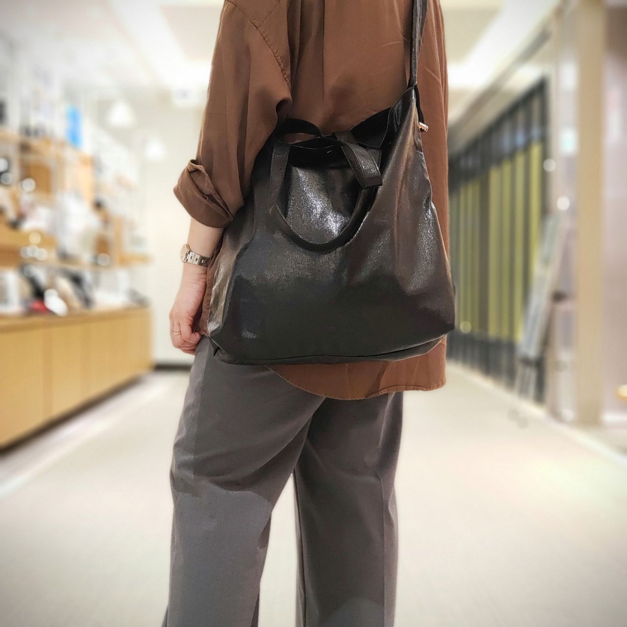 クラック感のあるメタリック生地のショルダーバッグです。