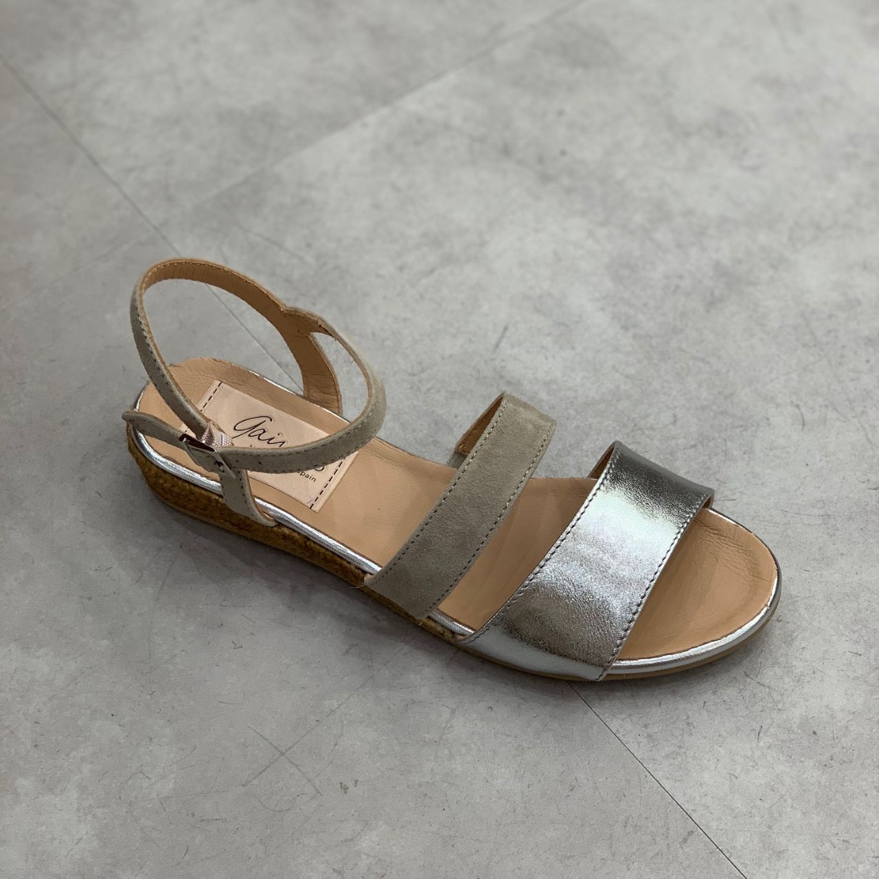 スエードとメタリックレザーの異素材コンビが特徴的なエスパドリーユ。