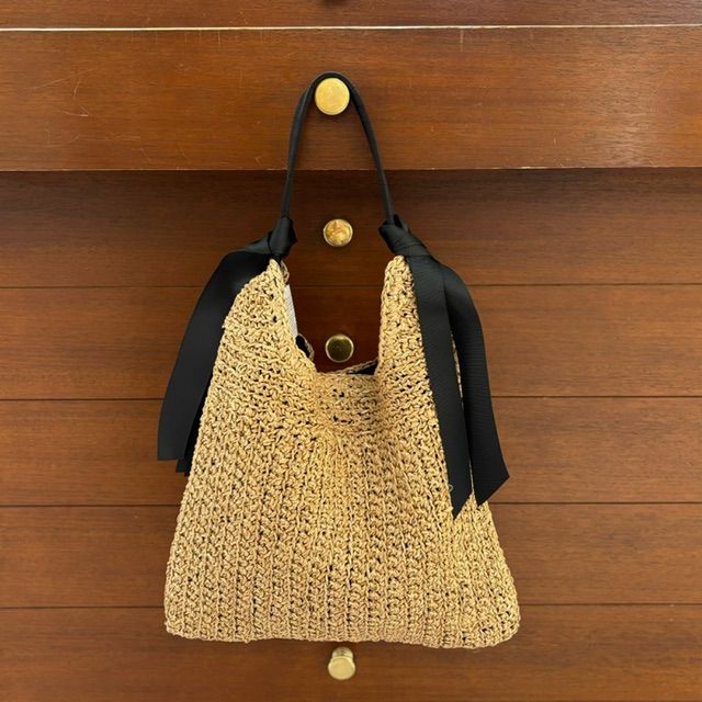 両サイドに垂れるリボンがとっても可愛いトートバッグ。