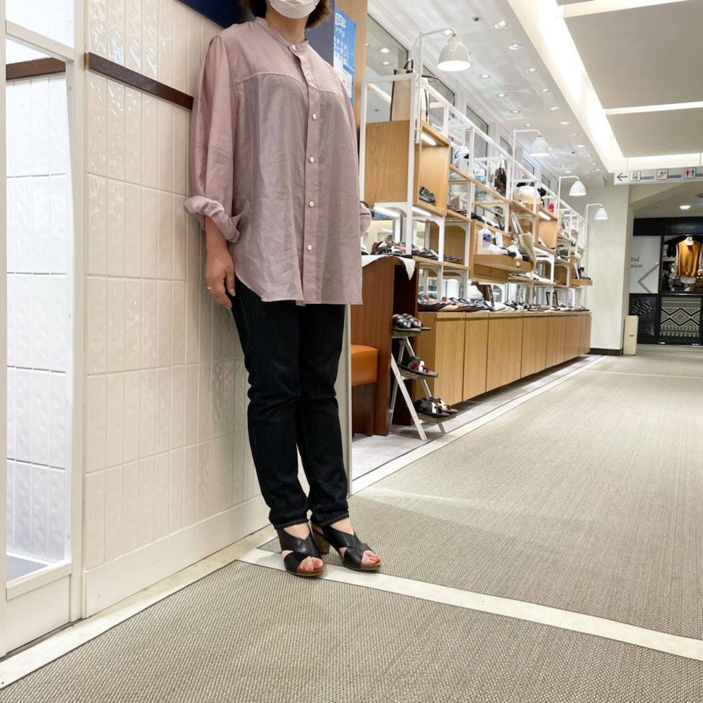 ちらりと見えるコルクのソールと木目調の太ヒールで抜け感が出るので
