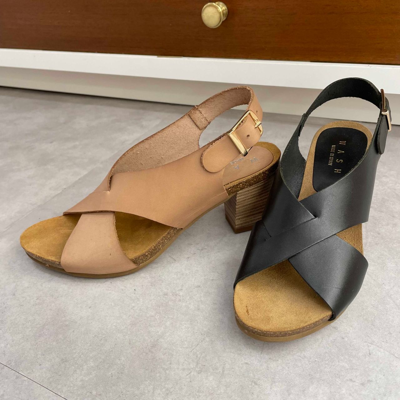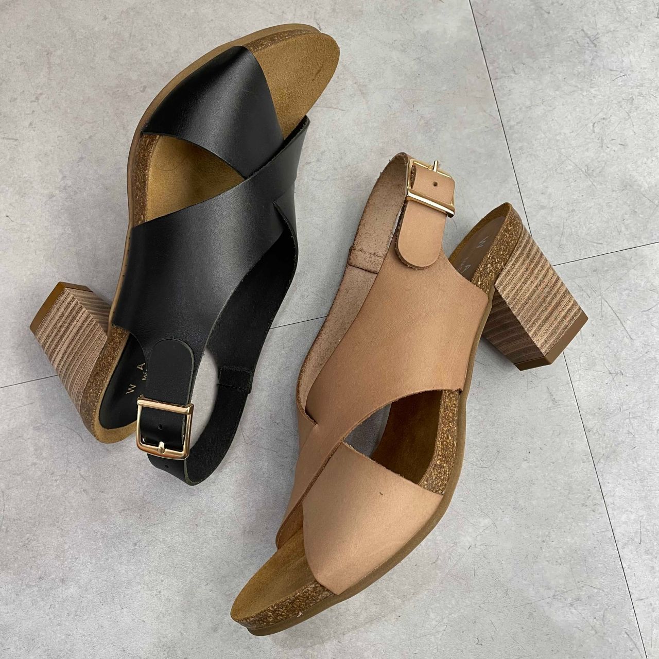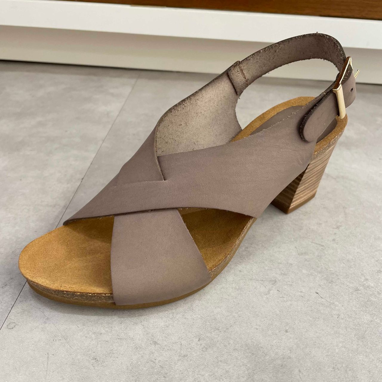 木目調の太ヒールがアクセントのナチュラルサンダルです。