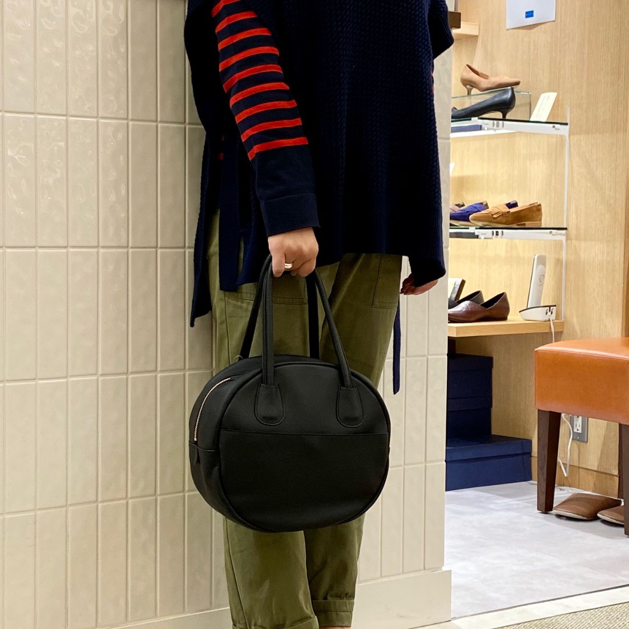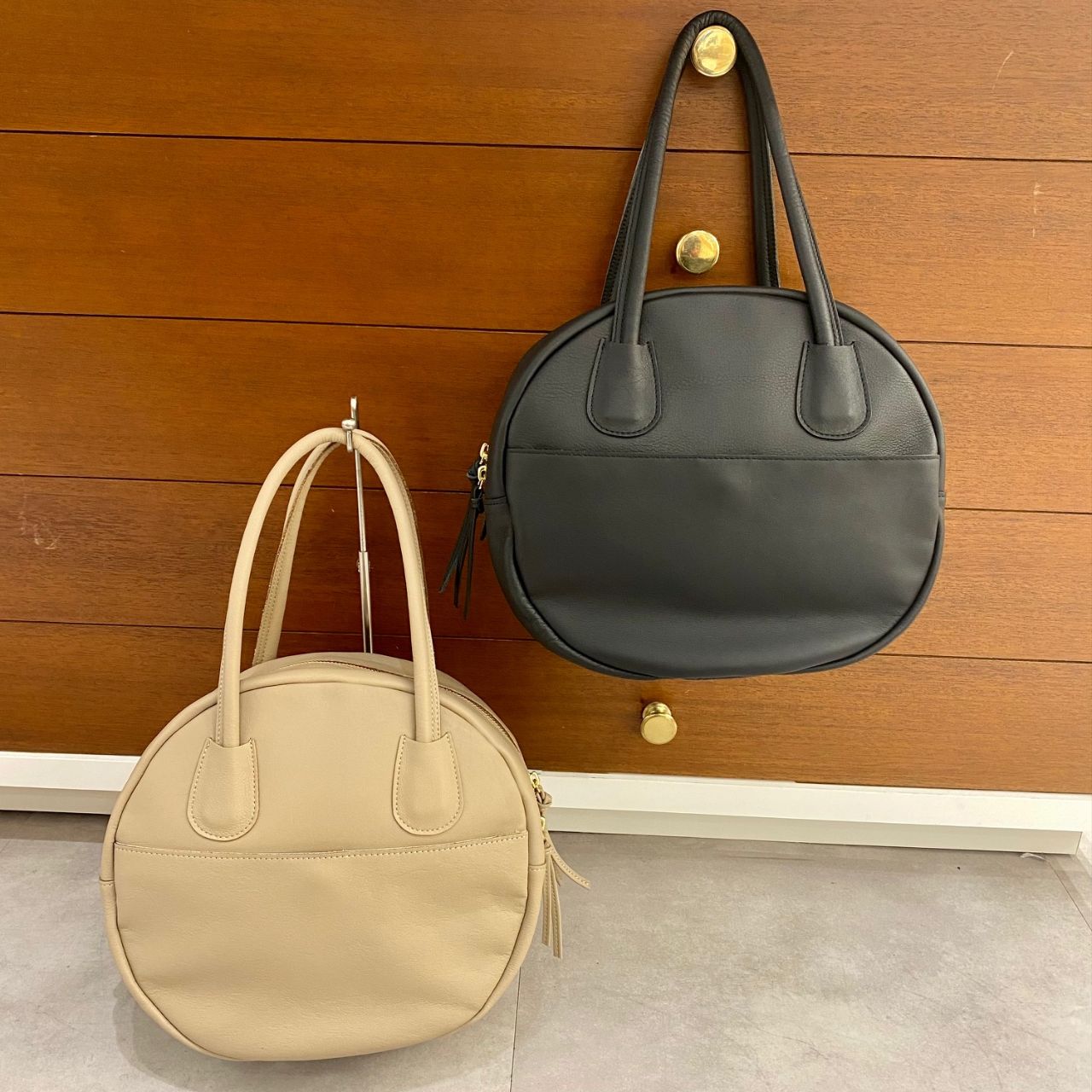 コロンとした丸いシルエットのレザーバッグ。