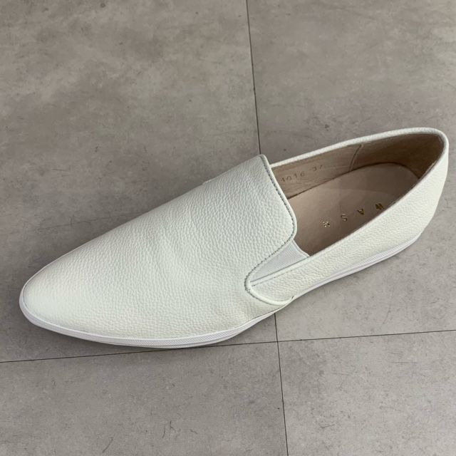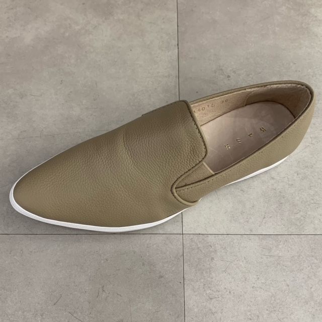 足元をすっきりと見せてくれるポインテッドトゥのスリッポン。