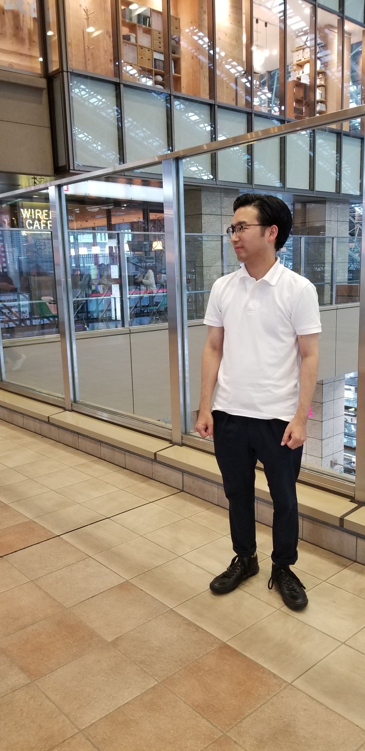 ホワイトのポロシャツにネイビーのパンツ。
