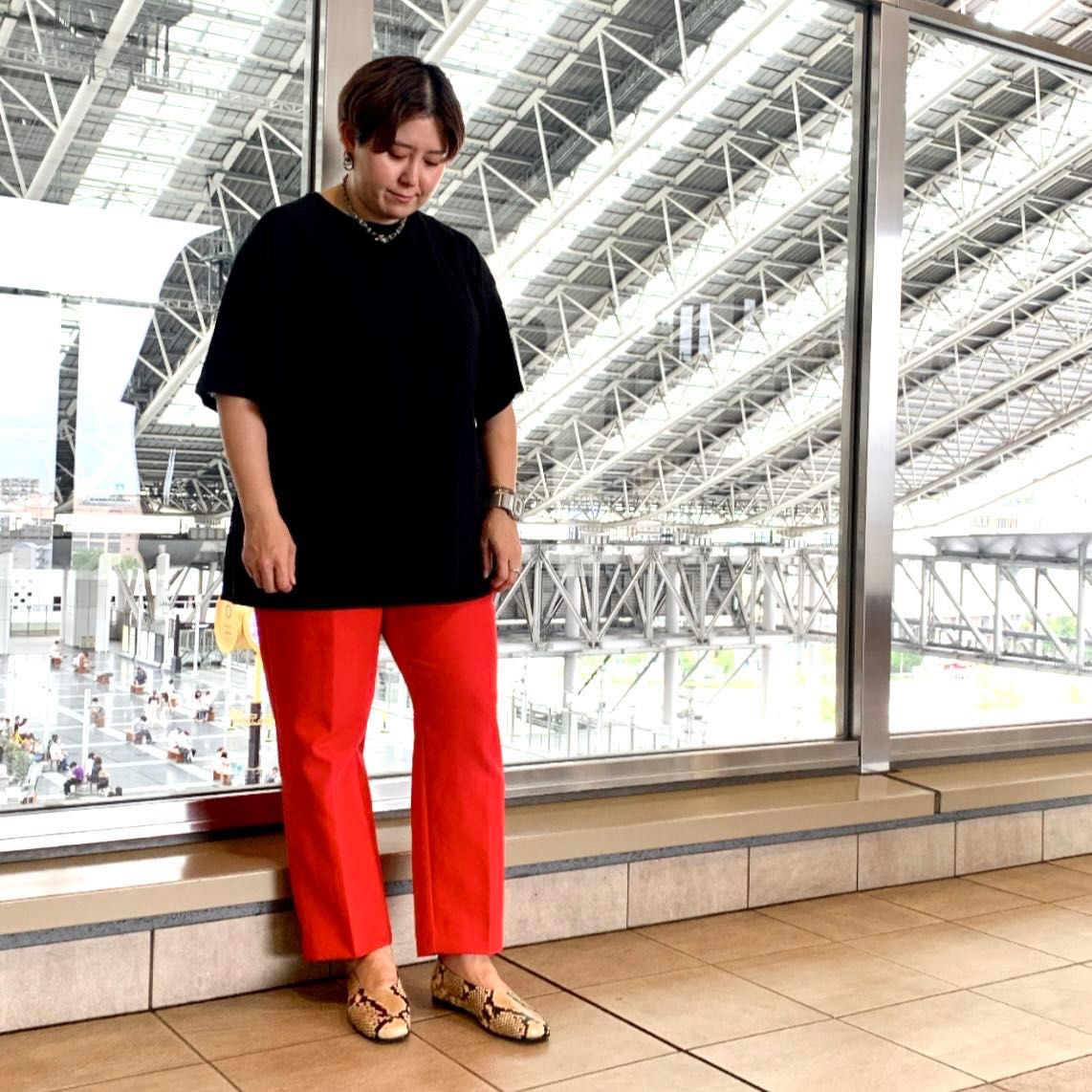 トレンドのカラーパンツにも、