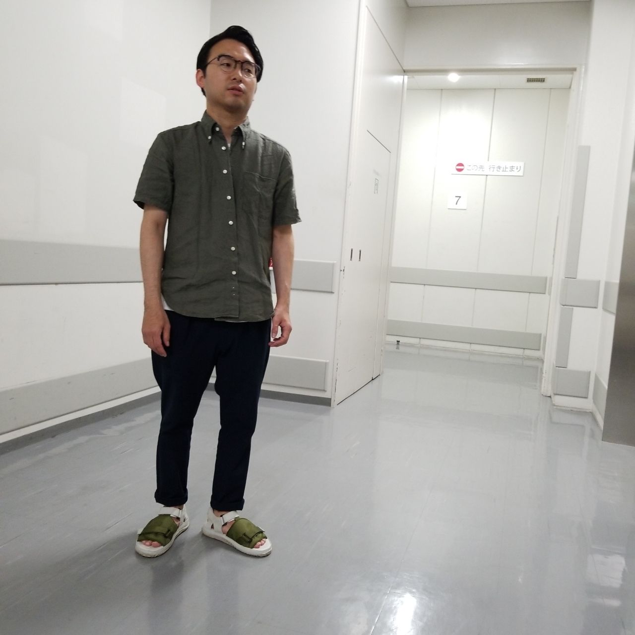 サンダルのカーキに合わせてトップスをカーキの半袖シャツをチョイス。