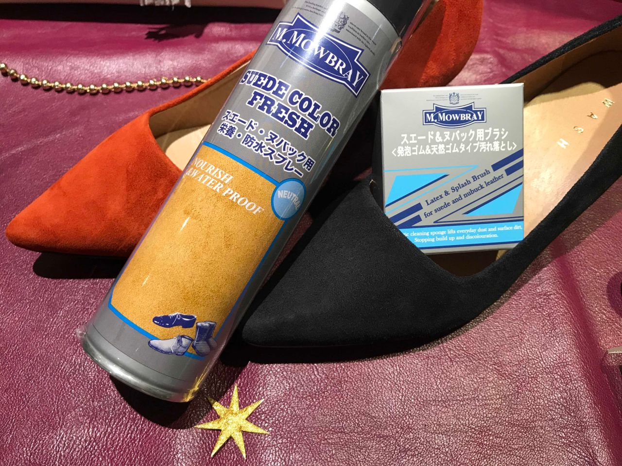 こちらのスエード用ブラシとスエード用防水スプレーお使いくださいませ。
