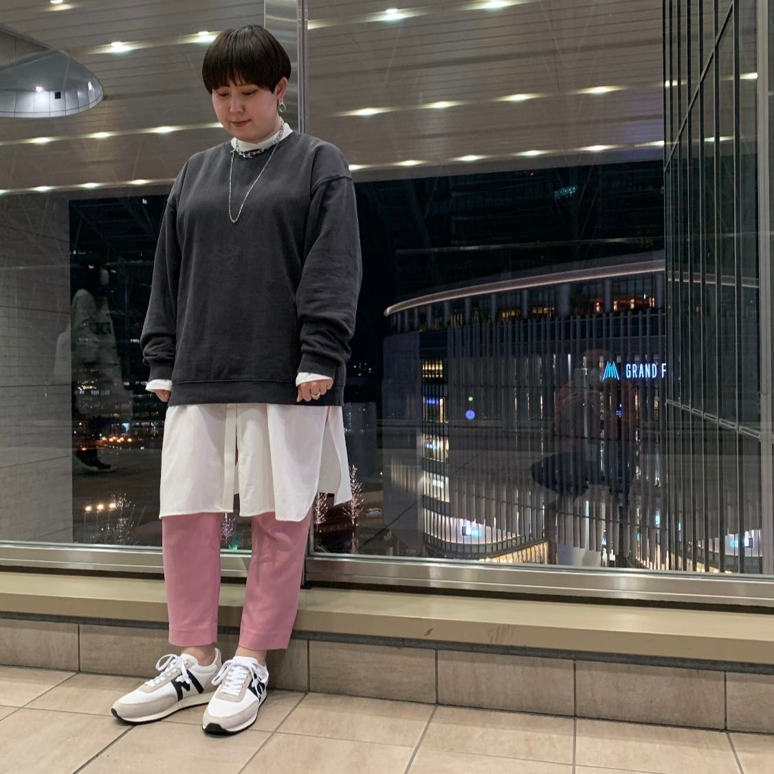 落ち感のある綺麗めシャツをスウェットの中にあわせてキチンと感を出しました。