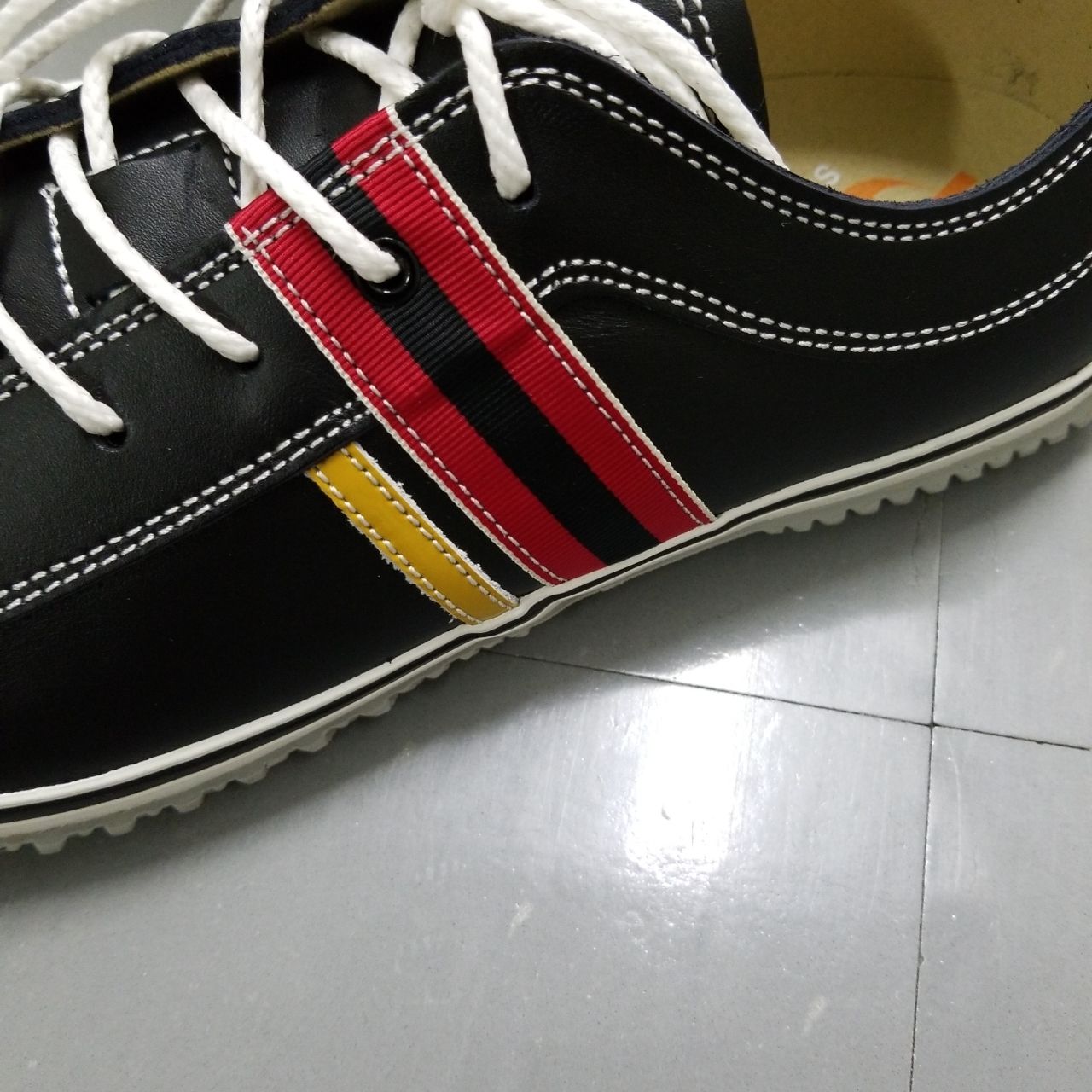 アッパーのブラックレザーに映える色合いのリボンテープですね。