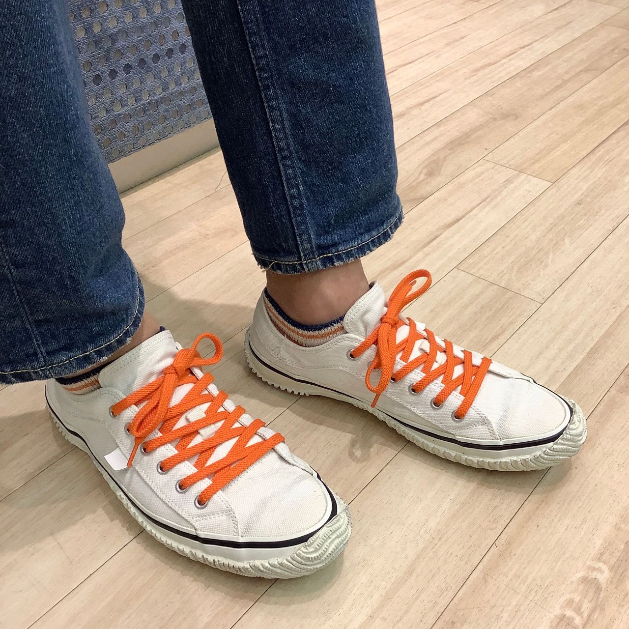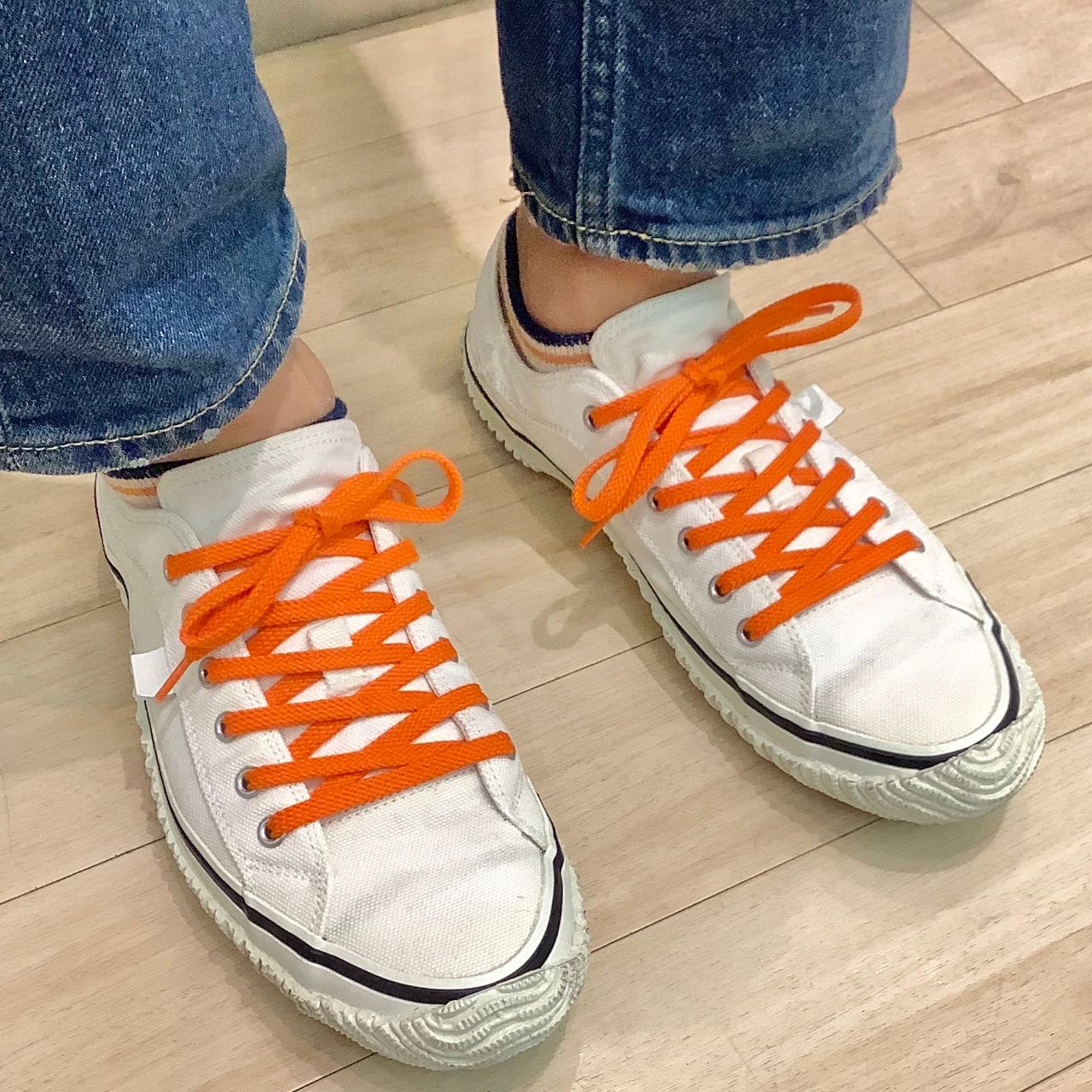 黒いテープのラインにオレンジのシューレース!