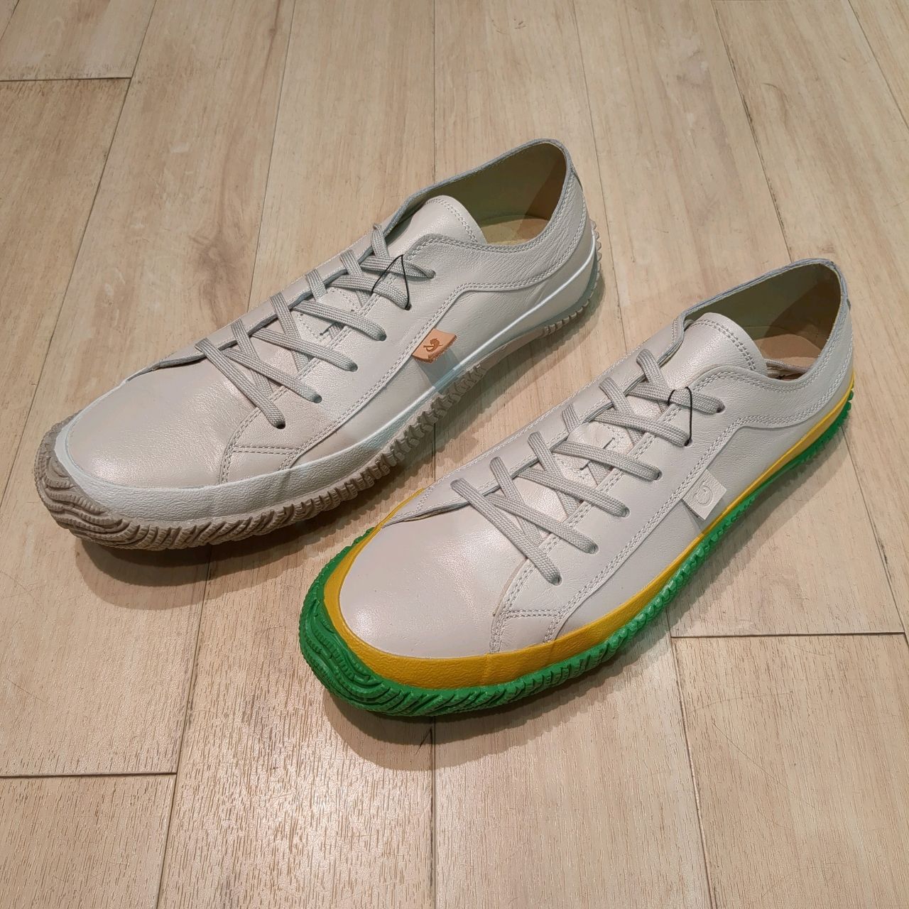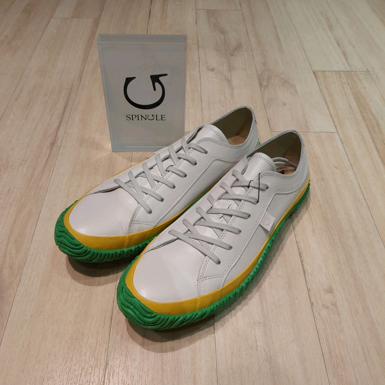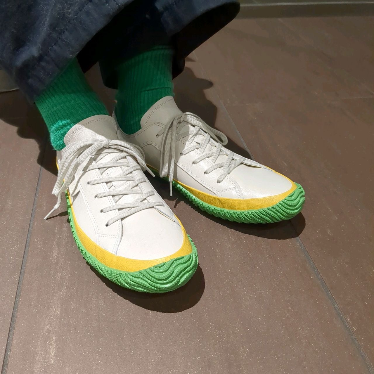 今まで、ネイビーやレッドなどのソールはありましたが、イエロー×グリーンは初めて!
