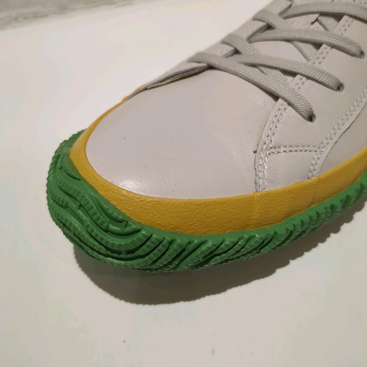 アッパー(レザー部)は定番のアイボリーとイエロー×グリーンのソールを組み合わせることで、安心感と新鮮さがあります。