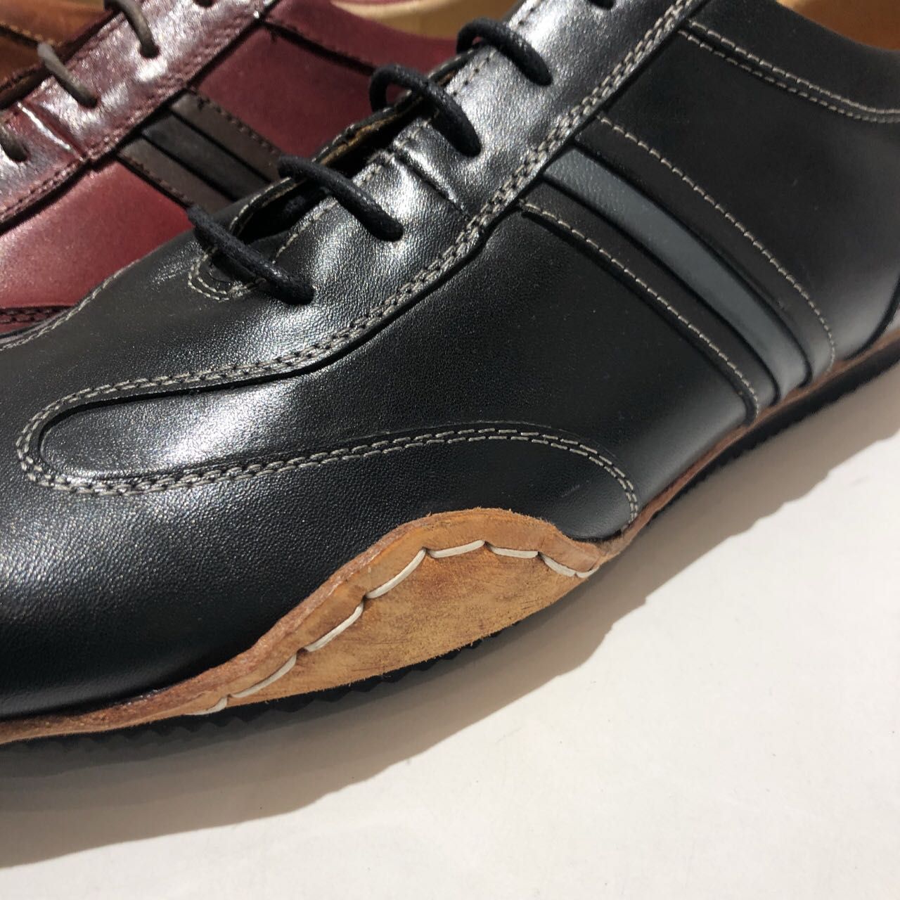 サイドと踵部分に見られる巻き上げた革ソールは、厳選された工場のみでの生産です。