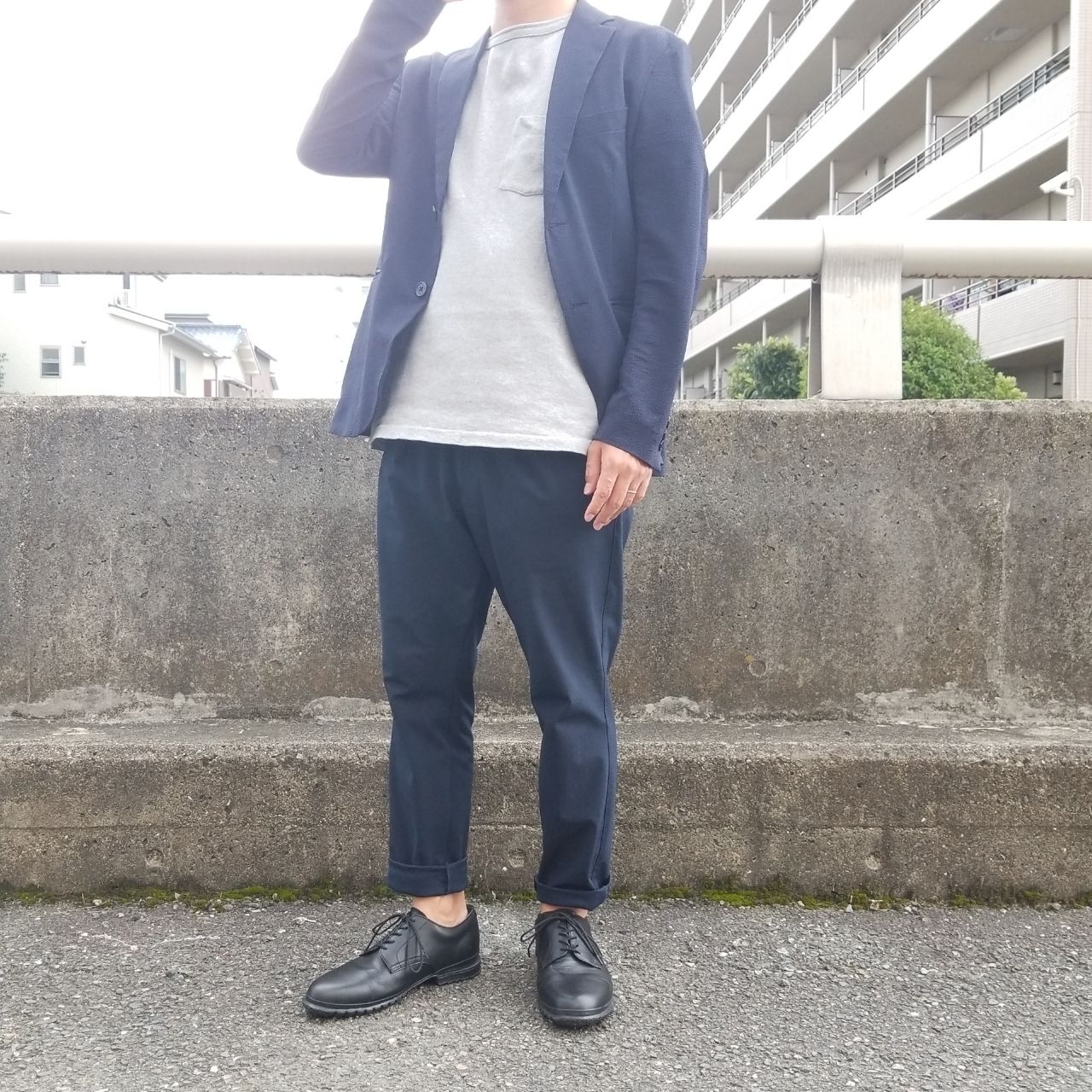 インナーにTシャツを合わせることで、堅苦しくなく、オフィスカジュアルやリモートワークの際にもオススメなコーディネートです。