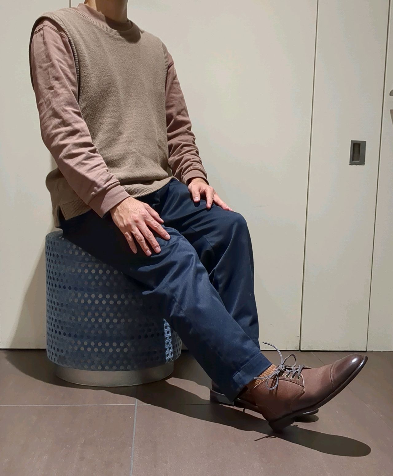 チェスターコートなどのきれいめなアイテムやチェック柄のスラックスとコーディネートしても、良いかなと思いました。