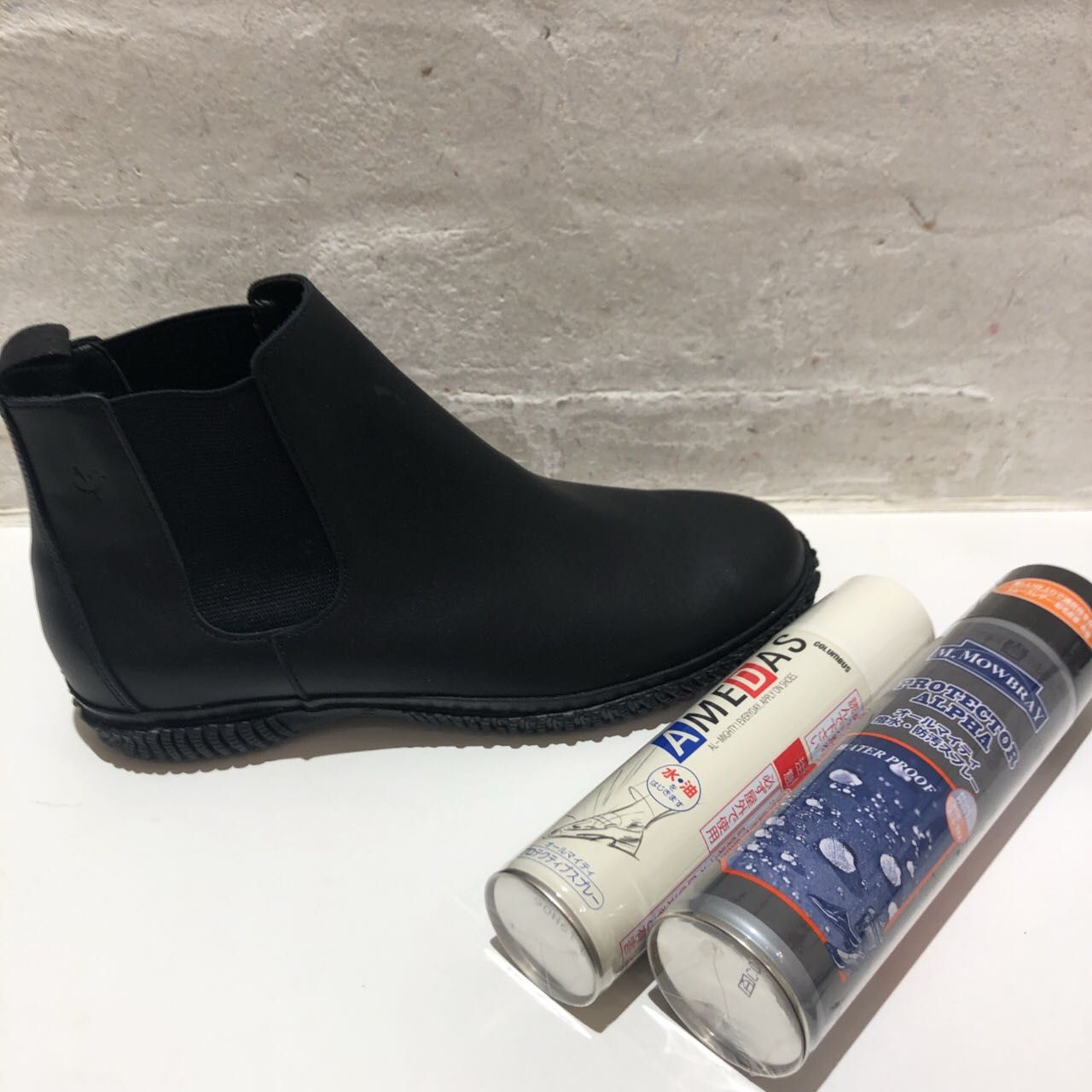 お出かけ前には写真に一緒に写っている、左:防水スプレーと右:プロテクターアルファ(共に¥1,500 +tax)もご利用ください。