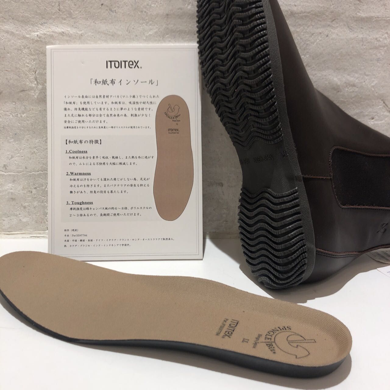 和紙素材のインソールは吸湿・速乾・耐摩耗性に優れております。