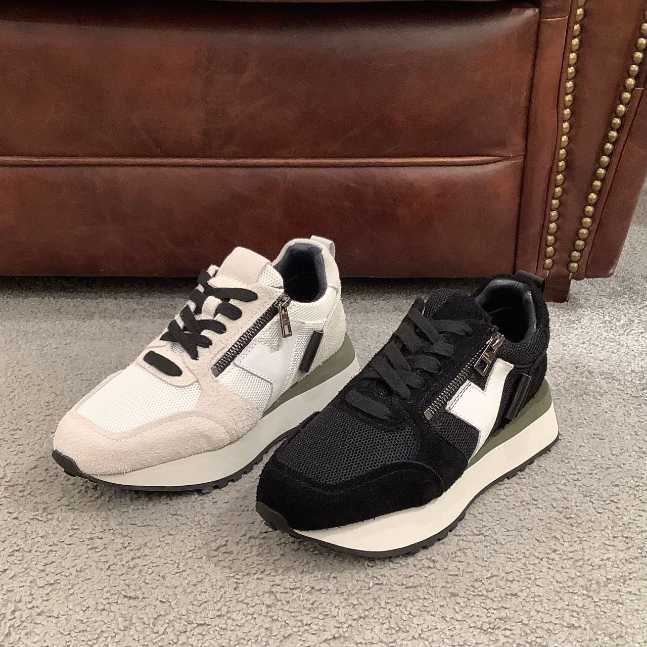 落ち着いた印象の中にも、ミッドソールのカーキがポイントです。