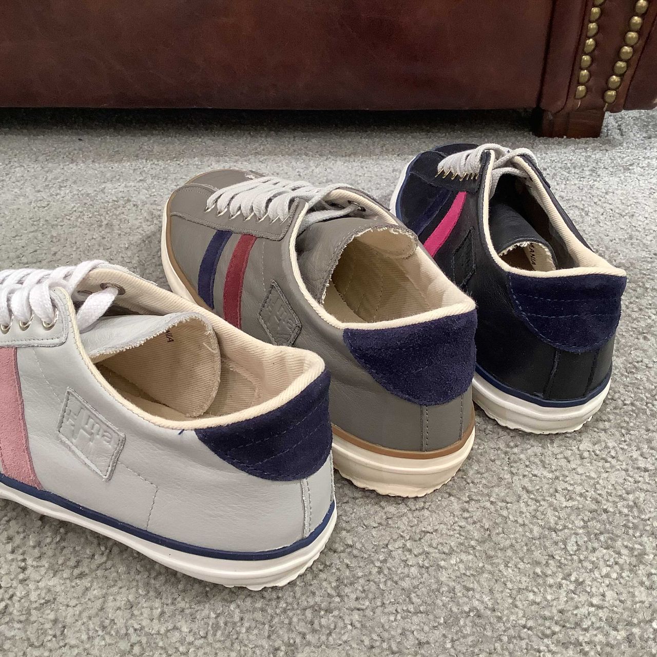WASHで取り扱っているマカロニアンは全て別注カラー。落ち着いたペールトーンの薄いグレーをベースにしたP/N/P(左)、グレーベースにワインのラインが秋らしいG/N/W(中央)、凛としたモードなクールネイビーをベースにビビットなピンクラインがポイントのN/N/F(右)。