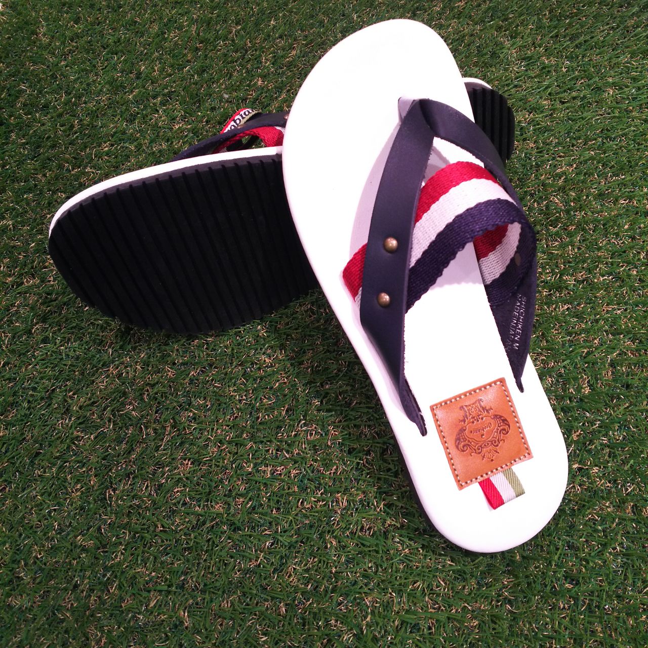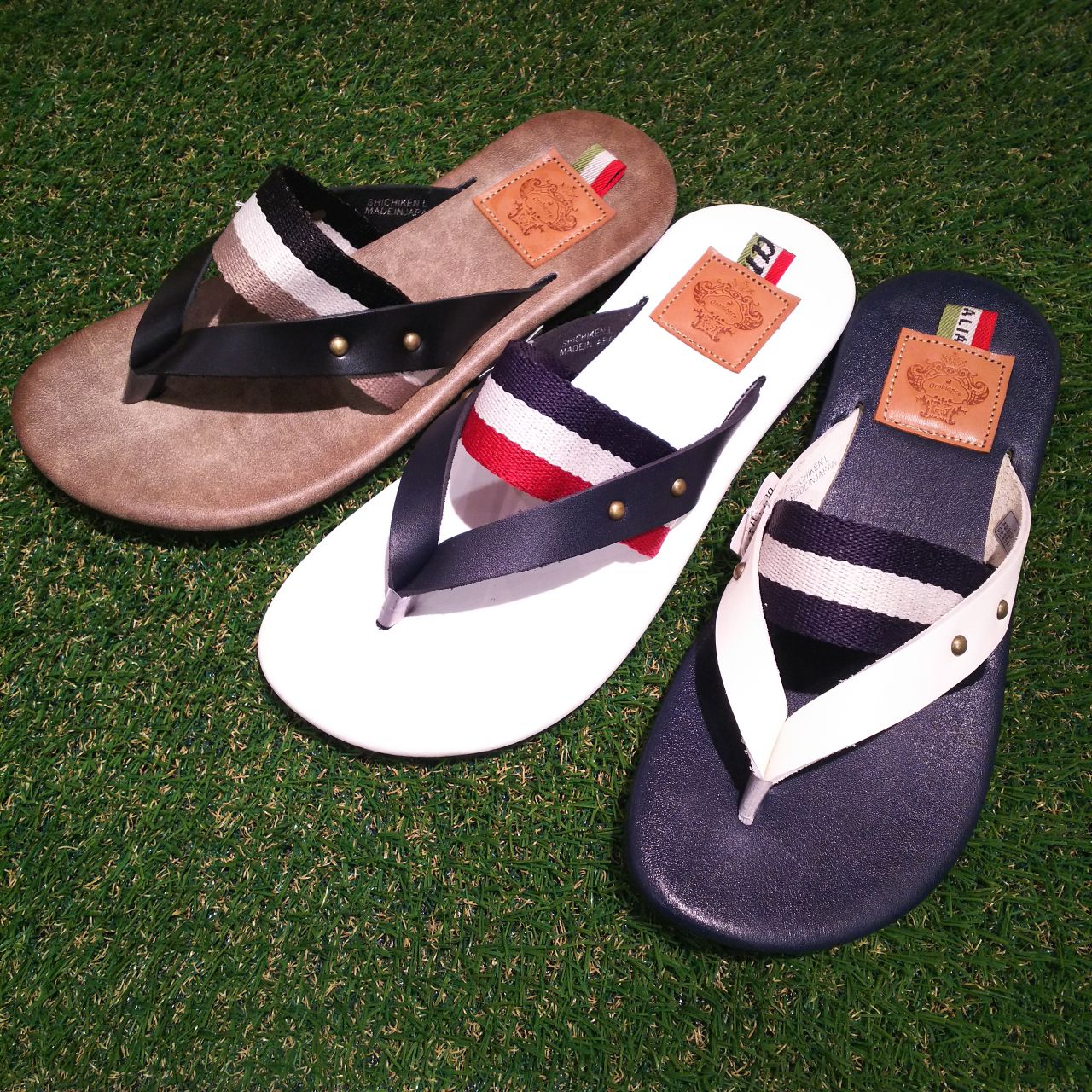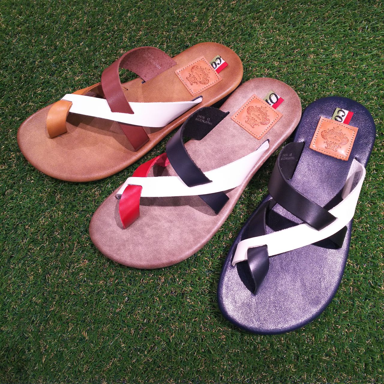 こちらのSHICHIKENモデルは、Orobiancoのバッグにも使用されるような持ち手ベルトをイメージしたボーダー柄のベルトとレザーを使った、定番的な形のトングサンダルです。