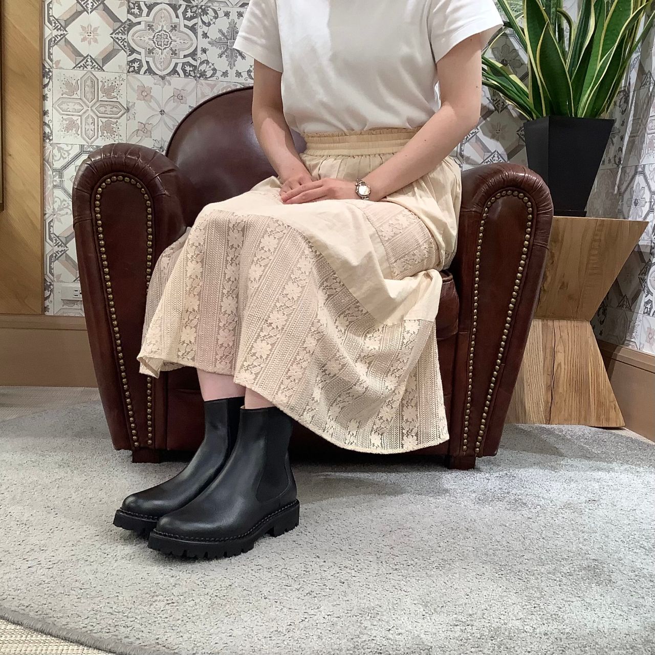 最近は軽やかな素材や色の洋服に、ブーツを履くスタイルがトレンド。
