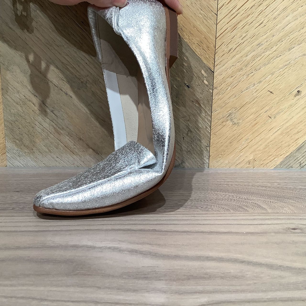 ソールの返りが良いため、写真のように靴底を大きく曲げることができ、足にフィットしてくれるためとても歩きやすいです。