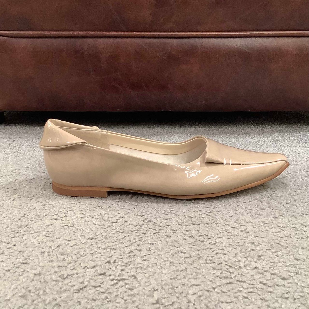 :ストッキングでぴったりです。エナメルですが足当たりは柔らかくストレスフリーな履き心地です。