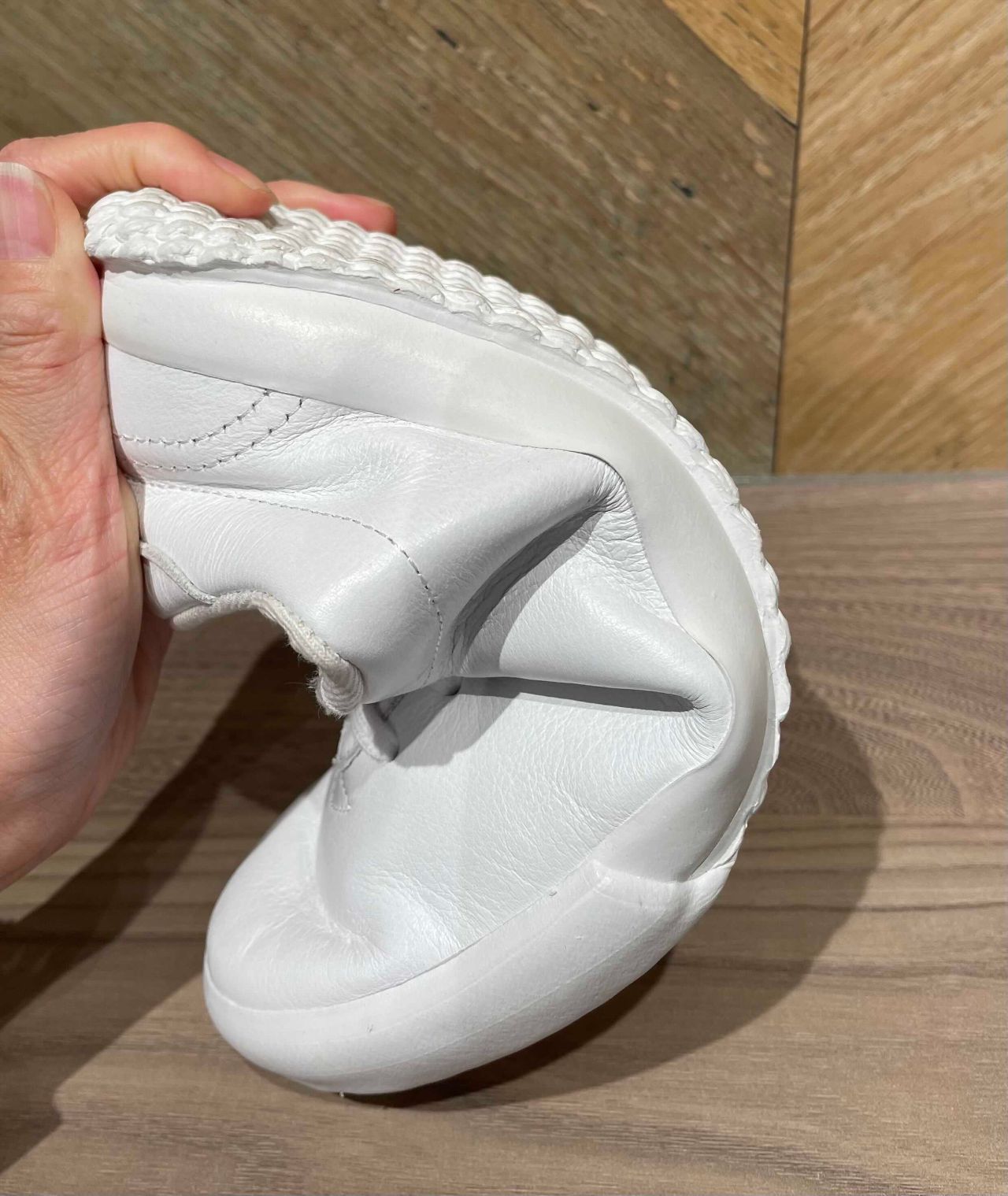 因みにバルカナイズ製法は、写真の通り屈伸性にも優れていてとても快適な履き心地です。