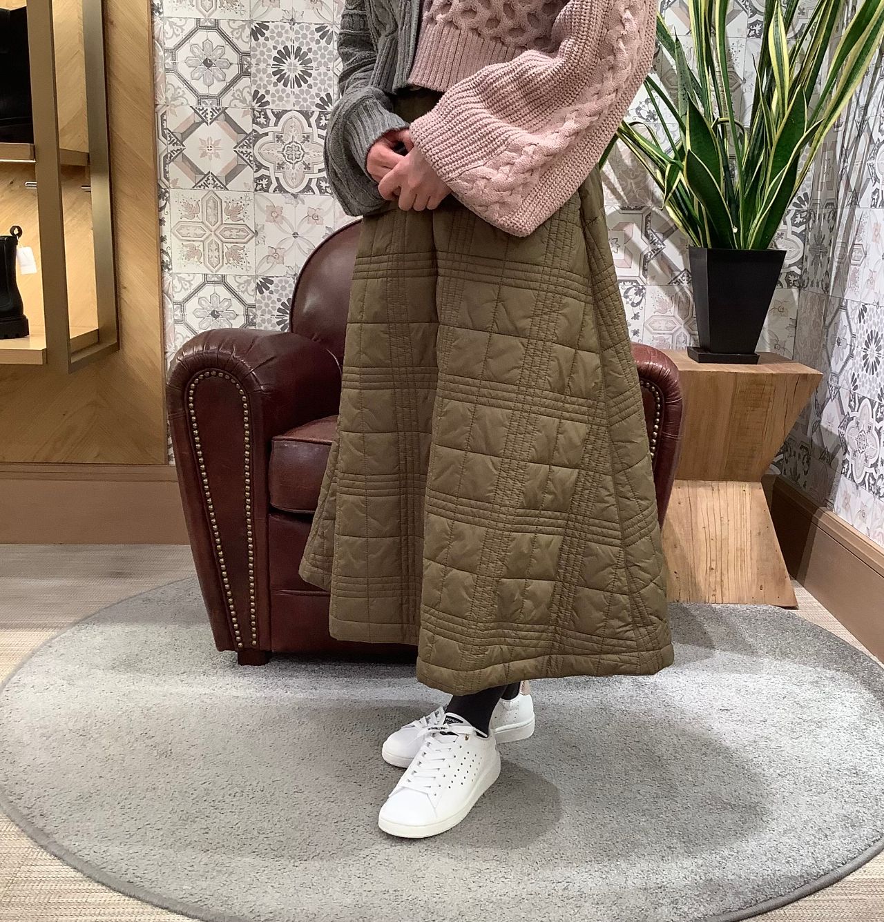 白ベースのシンプルな形のスニーカーなので、スカートに合わせてもスッキリ履けます。