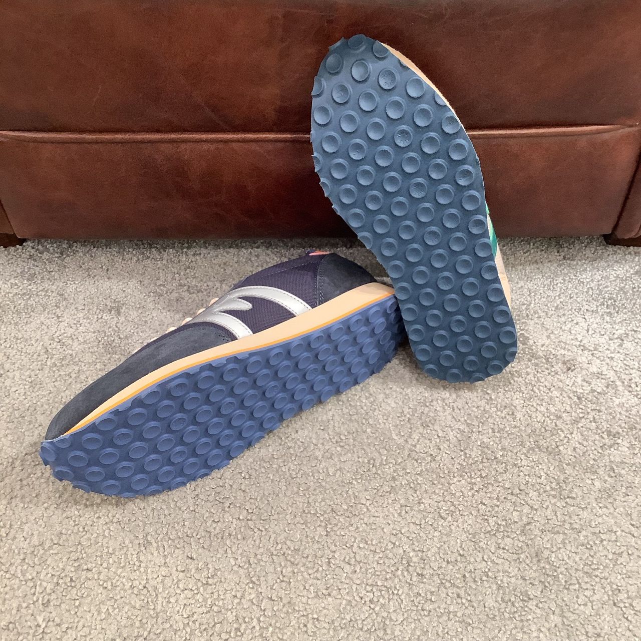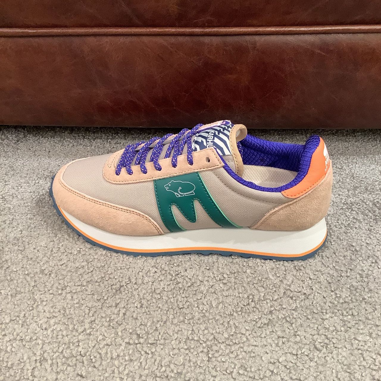 ブルー・オレンジ・グリーンの色使いが珍しい1足。ベースとなる色は淡いベージュ系なので、柔らかい雰囲気のお洋服にも合わせやすいです。