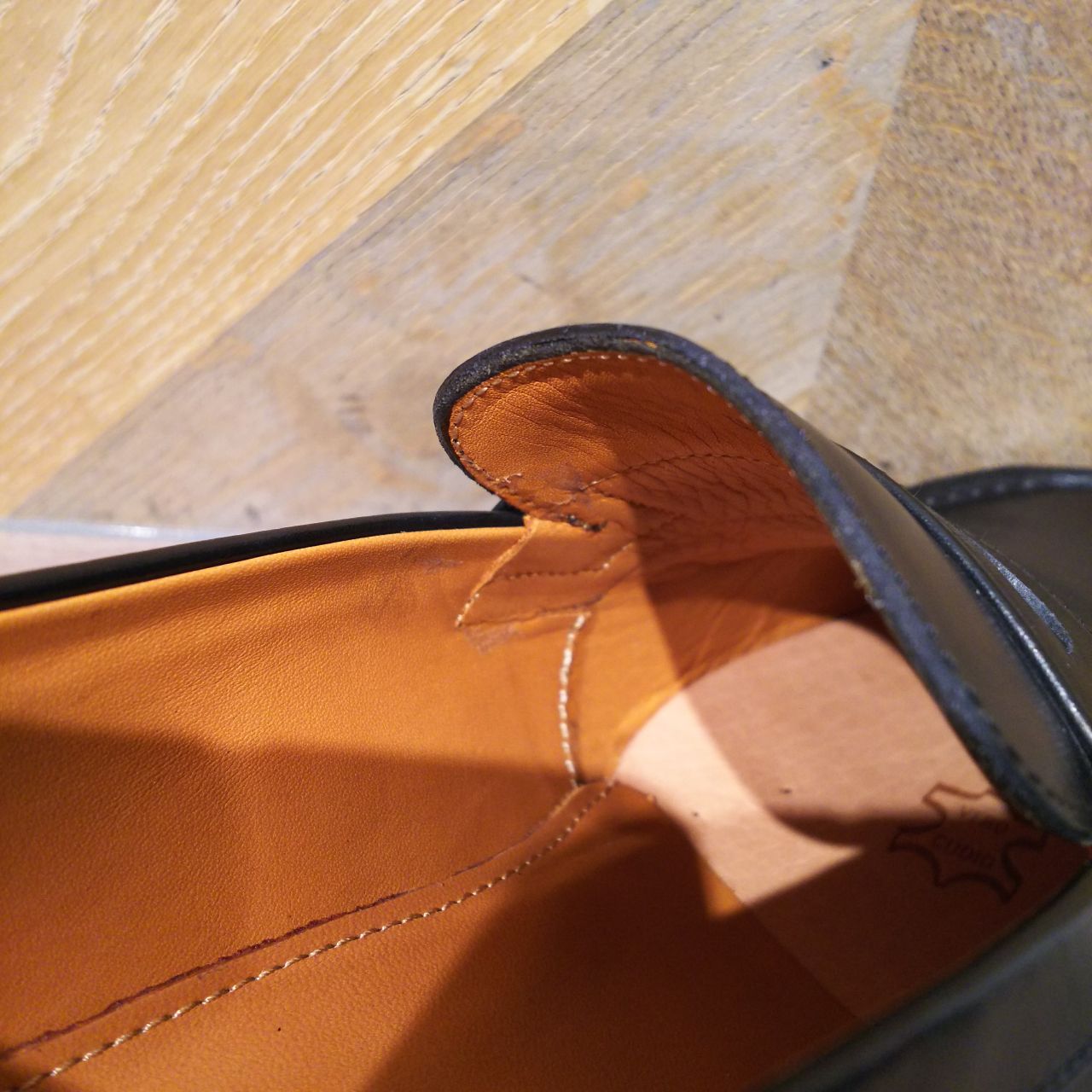 サドルの縫い付け(かんぬき縫い)部分の内部仕上げです。足当たりが滑らかになるよう、履き心地への配慮が感じられます。