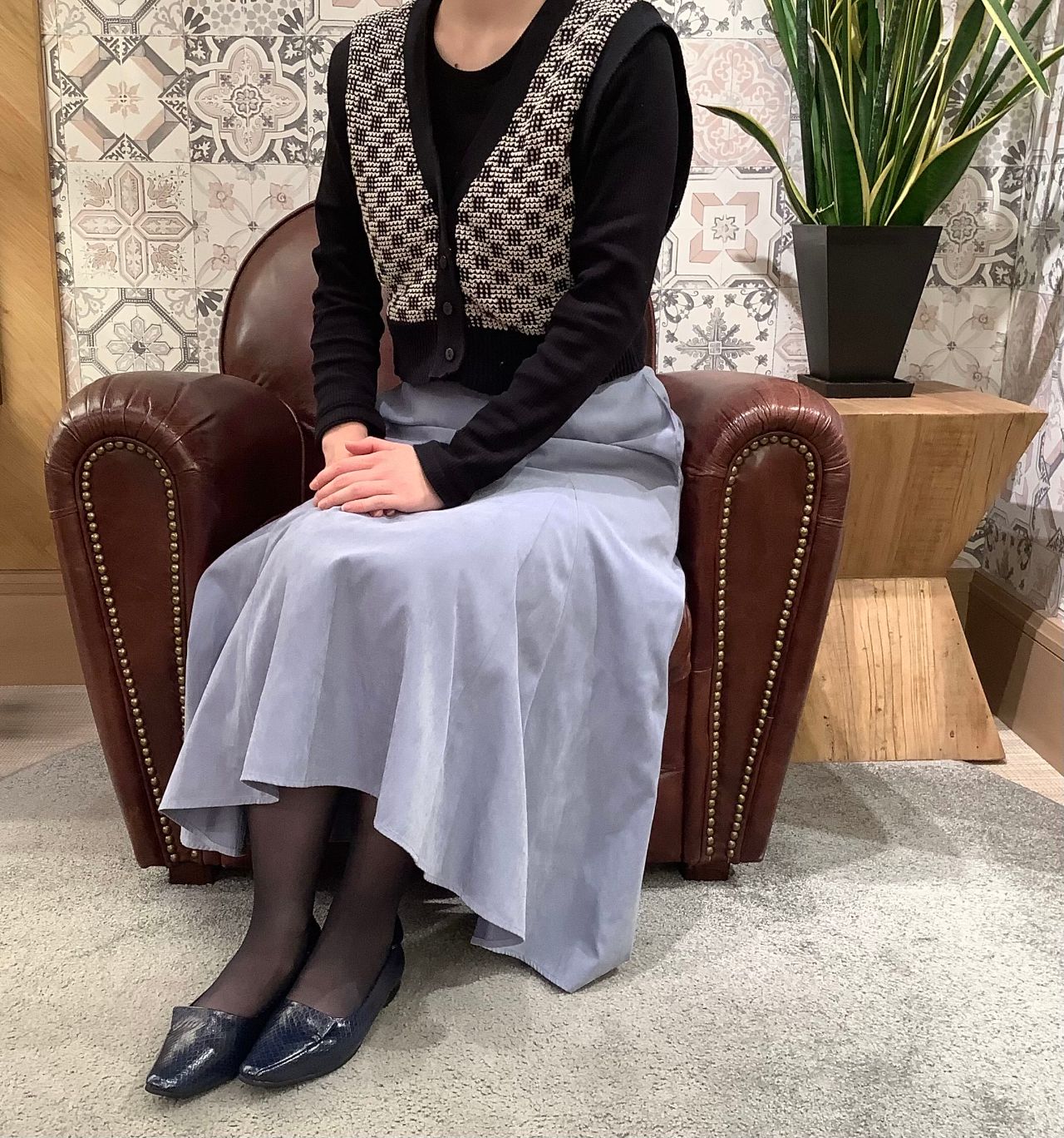スカートと合わせると、女性らしく上品な印象になります。