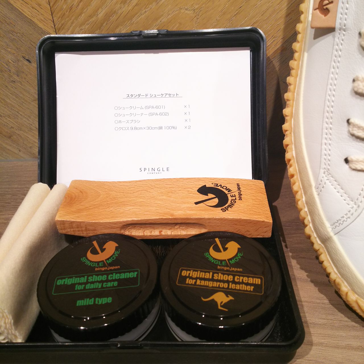カンガルーレザーのお手入れにはこちら。クリーナーとカンガルーレザー用クリーム、ブラシとクロスがセットになったスピングル特製シューケアセットがございます。クリームとクリーナーは個別にもご用意しております。