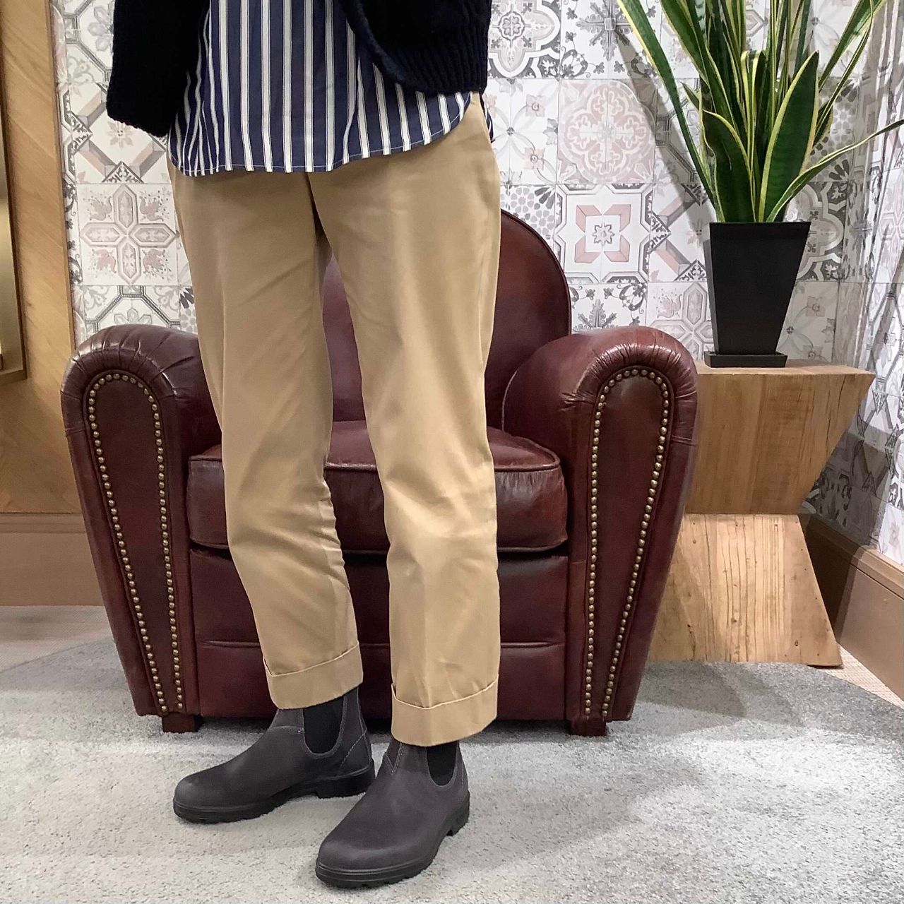 スエード独特の質感が、薄めのカラーのチノでもまとめやすく、使い勝手も抜群です。