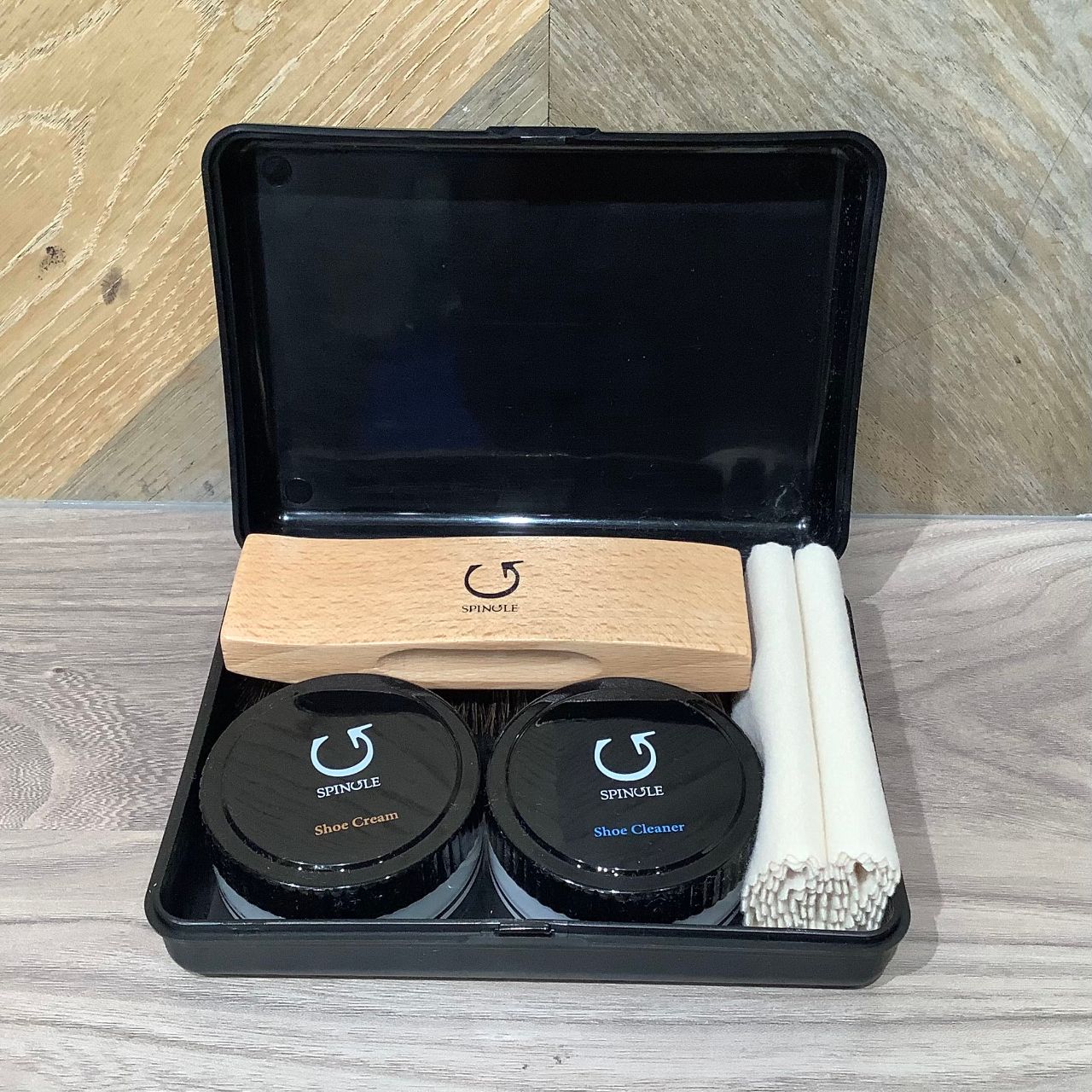 クリーナーとカンガルーレザーにもおすすめのクリーム、ホースブラシとクロスがセットになったスピングル特製シューケアセットがございます。